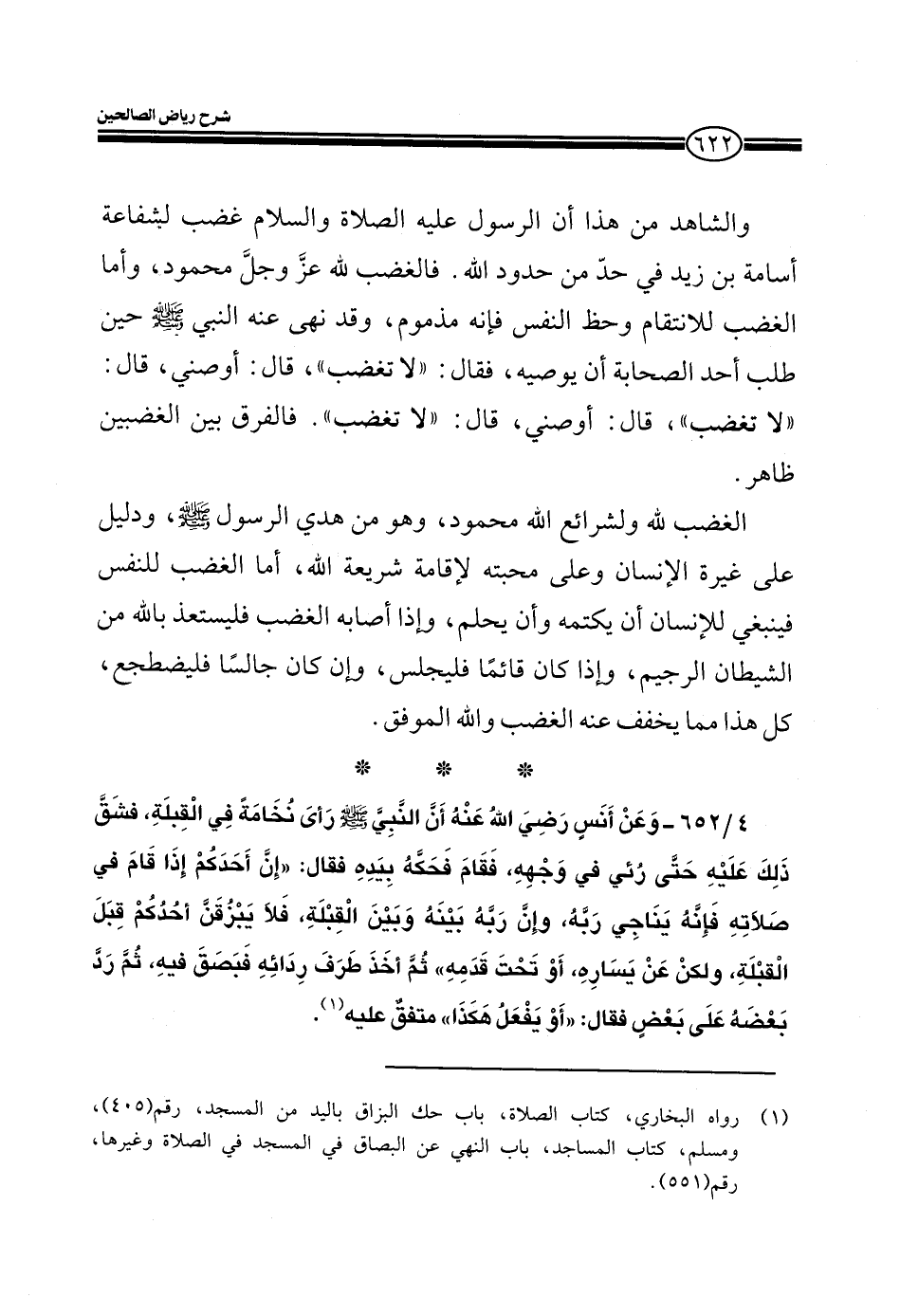 4/652- وعن أنس رضي الله عنه أن النبي صلى الله عليه وسلم رأى نُخامة في القبلة، فشق ذلك عليه حتى رُئي في وجهه، فقام فحكه بيده فقال: ((إن أحدكم إذا قام في صلاته فإنهُ يناجي ربهُ، وإن ربه بينهُ وبين القبلةِ فلا يبزقن أحدكم قبل القبلة، ولكن عن يساره، أو تحت قدمه، ثُم أخذ طرف ردائه فبصق فيه، ثم رد بعضهُ على بعضٍ فقال: ((أو يفعل هكذا)) متفقٌ عليه.