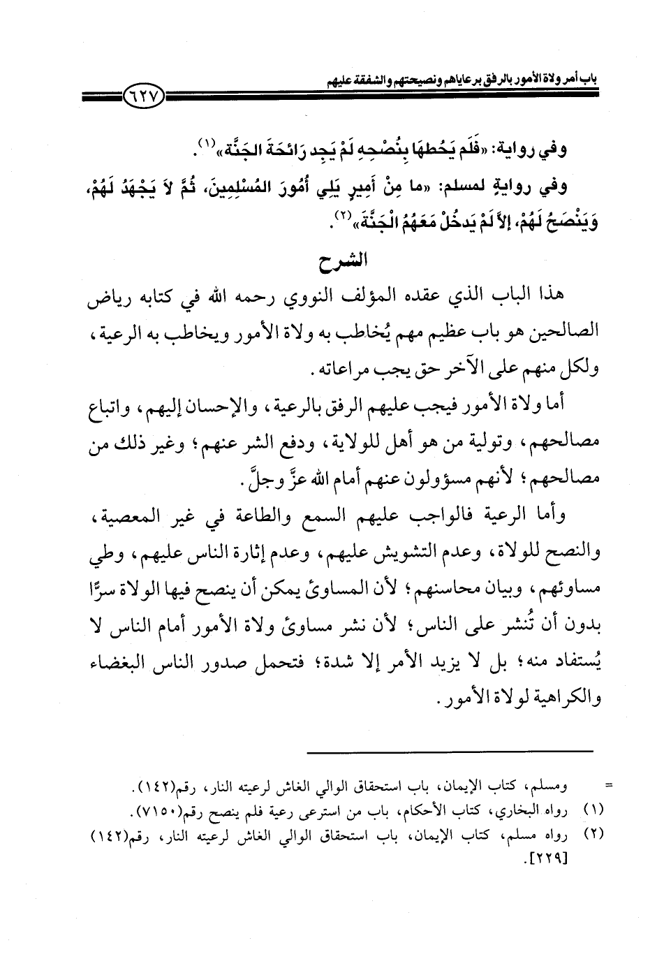 EXهذا الباب الذي عقده المؤلف النووي رحمه الله في كتابه رياض الصالحين هو باب عظيم مهم يُخاطب به ولاة الأمور ويخاطب به الرعية، ولكل منهم على الآخر حق يجب مراعاته.