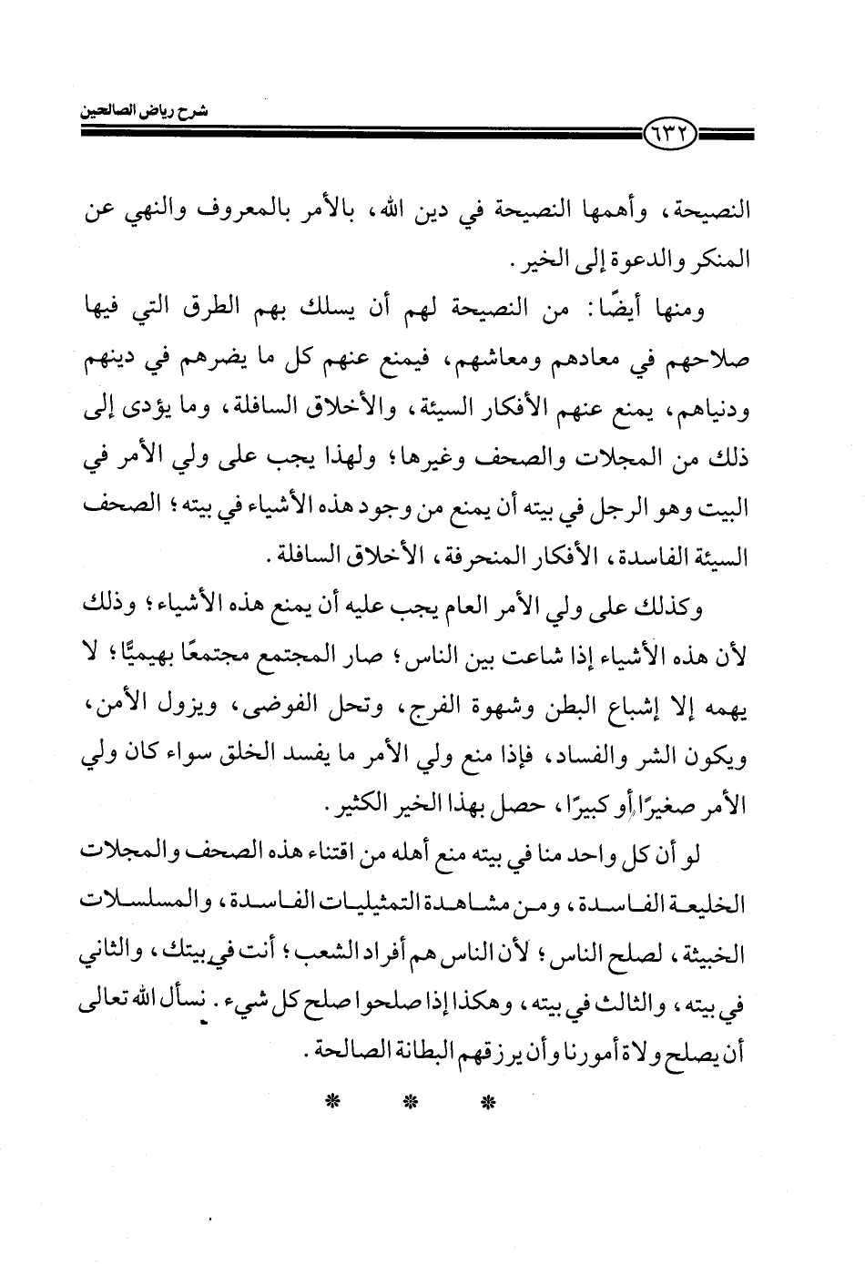 ومنها أيضاً: من النصيحة لهم أن يسلك بهم الطرق التي فيها صلاحهم في معادهم ومعاشهم، فيمنع عنهم كل ما يضرهم في دينهم ودنياهم، يمنع عنهم الأفكار السيئة، والأخلاق السافلة، وما يؤدى إلى ذلك من المجلات والصحف وغيرها؛ ولهذا يجب على ولي الأمر في البيت وهو الرجل في بيته أن يمنع من وجود هذه الأشياء في بيته؛ الصحف السيئة الفاسدة، الأفكار المنحرفة، الأخلاق السافلة.
