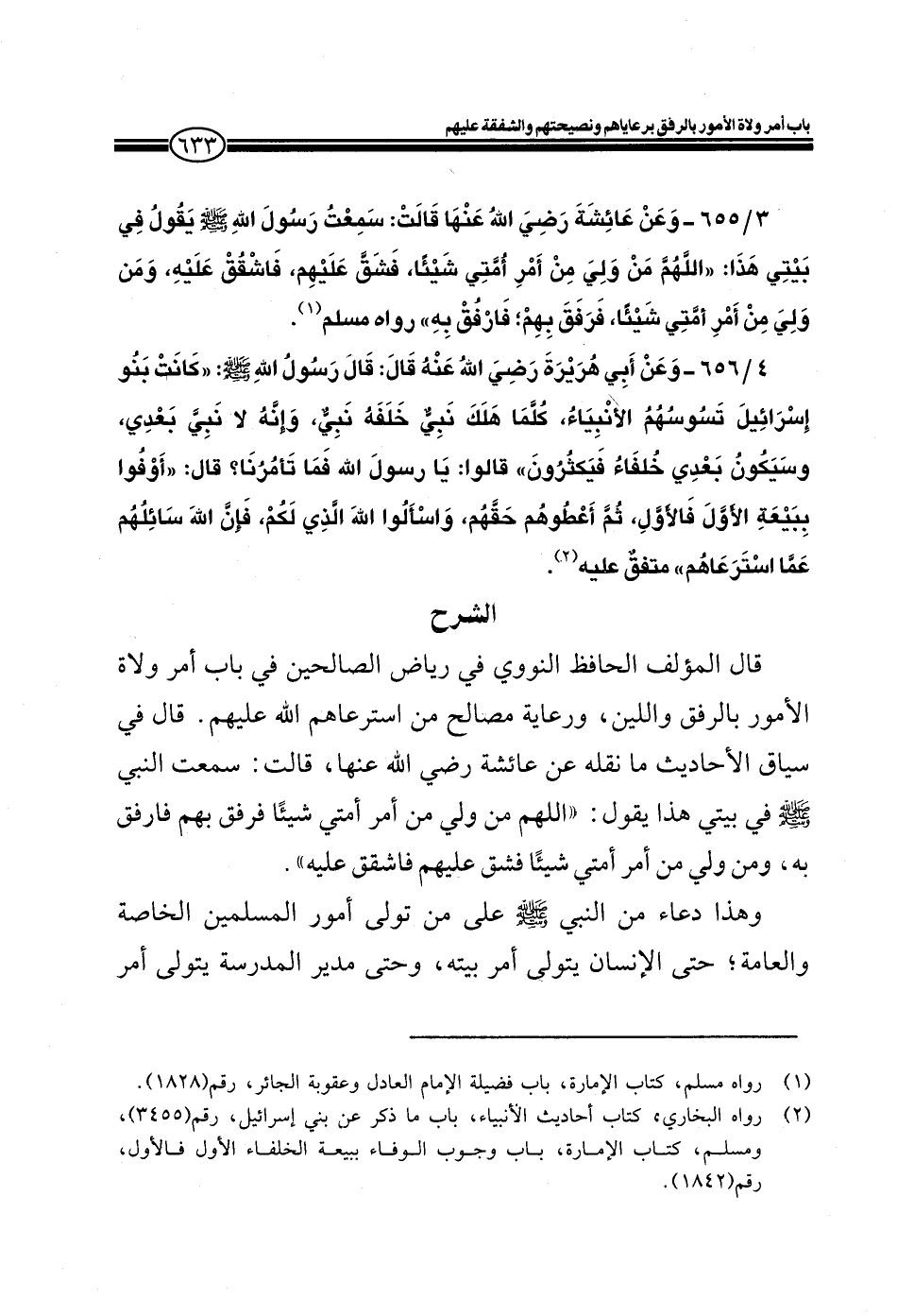 EXقال المؤلف الحافظ النووي في رياض الصالحين في باب أمر ولاة الأمور بالرفق واللين، ورعاية مصالح من استرعاهم الله عليهم. قال في سياق الأحاديث ما نقله عن عائشة رضي الله عنها، قالت: سمعت النبي صلى الله عليه وسلم في بيتي هذا يقول: ((اللهم من ولي من أمر أمتي شيئاً فرفق بهم فارفق به، ومن ولي من أمر أمتي شيئاً فشق عليهم فاشقق عليه)) .
