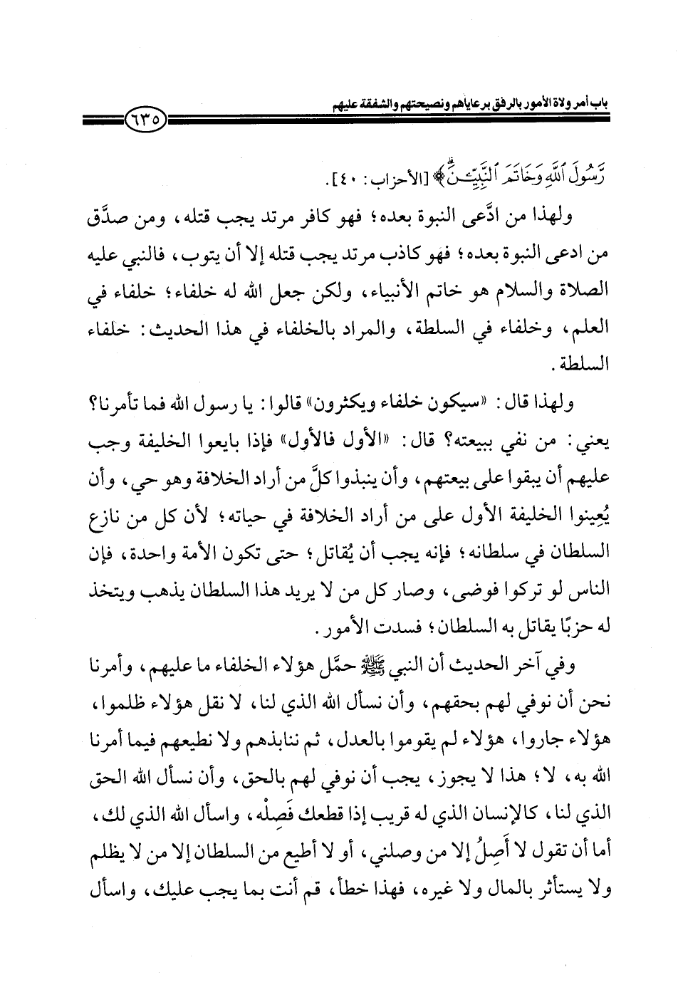 ولهذا من ادَّعى النبوة بعده؛ فهو كافر مرتد يجب قتله، ومن صدّق من ادعى النبوة بعده؛ فهو كاذب مرتد يجب قتله إلا أن يتوب، فالنبي عليه الصلاة والسلام هو خاتم الأنبياء، ولكن جعل الله له خلفاء؛ خلفاء في العلم، وخلفاء في السلطة، والمراد بالخلفاء في هذا الحديث: خلفاء السلطة.