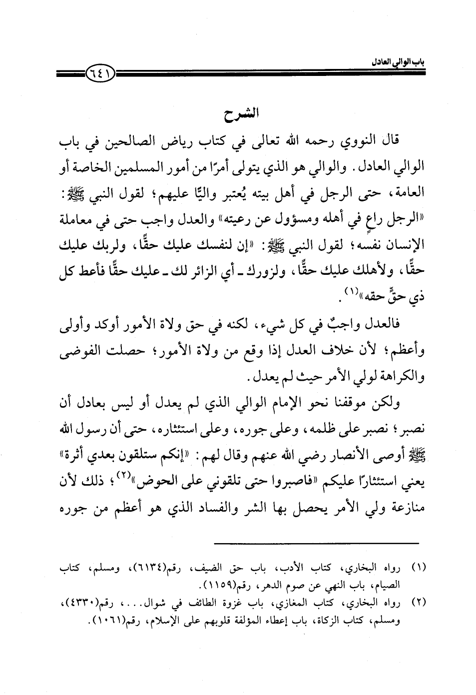 EXقال النووي رحمه الله تعالى في كتاب رياض الصالحين في باب الوالي العادل. والوالي هو الذي يتولى أمراً من أمور المسلمين الخاصة أو العامة، حتى الرجل في أهل بيته يُعتبر والياً عليهم؛ لقول النبي صلى الله عليه وسلم ((الرجل راع في أهله ومسؤول عن رعيته)) والعدل واجب حتى في معاملة الإنسان نفسه؛ لقول النبي صلى الله عليه وسلم: ((إن لنفسك عليك حقاً، ولربك عليك حقاً، ولأهلك عليك حقاً، ولزورك- أي الزائر - عليك حقاً فأعط كل ذي حقّ حقه)) .