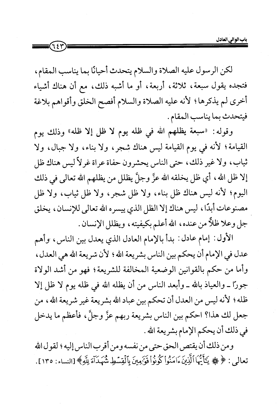 الأول: إمام عادل: بدأ بالإمام العادل الذي يعدل بين الناس، وأهم عدل في الإمام أن يحكم بني الناس بشريعة الله؛ لأن شريعة الله هي العدل، وأما من حكم بالقوانين الوضعية المخالفة للشريعة؛ فهو من أشد الولاة جوراً- والعياذ بالله- وأبعد الناس من أن يظله الله في ظله يوم لا ظل إلا ظله؛ لأنه ليس من العدل أن تحكم بين عباد الله بشريعة غير شريعة الله، من جعل لك هذا؟ احكم بين الناس بشريعة ربهم عزّ وجلّ، فأعظم ما يدخل في ذلك أن يحكم الإمام بشريعة الله.