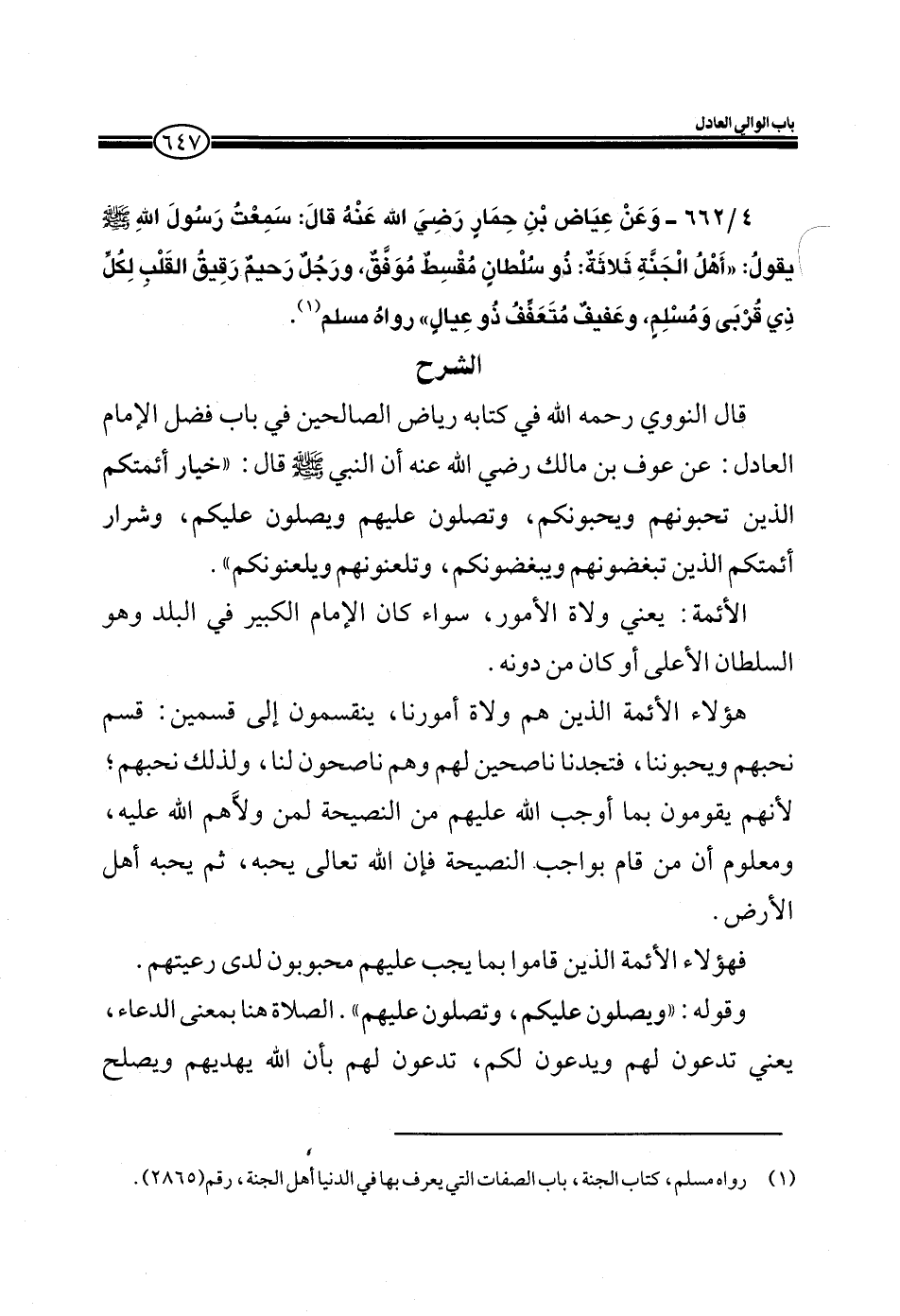 EXقال النووي رحمه الله في كتابه رياض الصالحين في باب فضل الإمام العادل: عن عوف بن مالك رضي الله عنه أن النبي صلى الله عليه وسلم قال: ((خيار أئمتكم الذين تحبونهم ويحبونكم، وتصلون عليهم ويصلون عليكم، وشرار أئمتكم الذين تبغضونهم ويبغضونكم، وتلعنونهم ويلعنونكم)) .