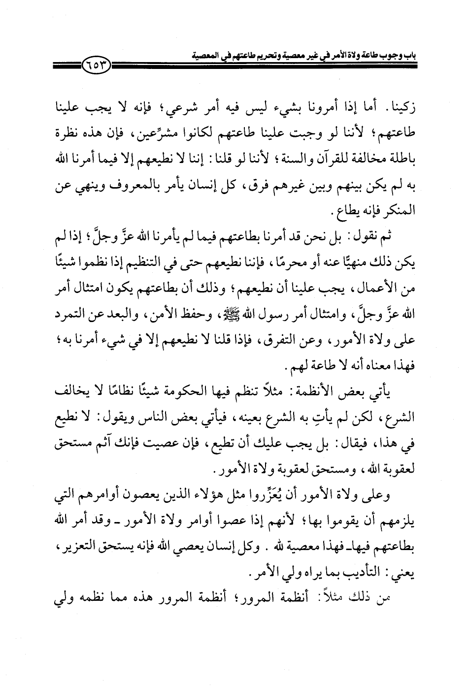 يأتي بعض الأنظمة: مثلاً تنظم فيها الحكومة شيئاً نظاماً لا يخالف الشرع، لكن لم يأتِ به الشرع بعينه، فيأتي بعض الناس ويقول: لا نطيع في هذا، فيقال: بل يجب عليك أن تطيع، فإن عصيت فإنك آثم مستحق لعقوبة الله، ومستحق لعقوبة ولاة الأمور.