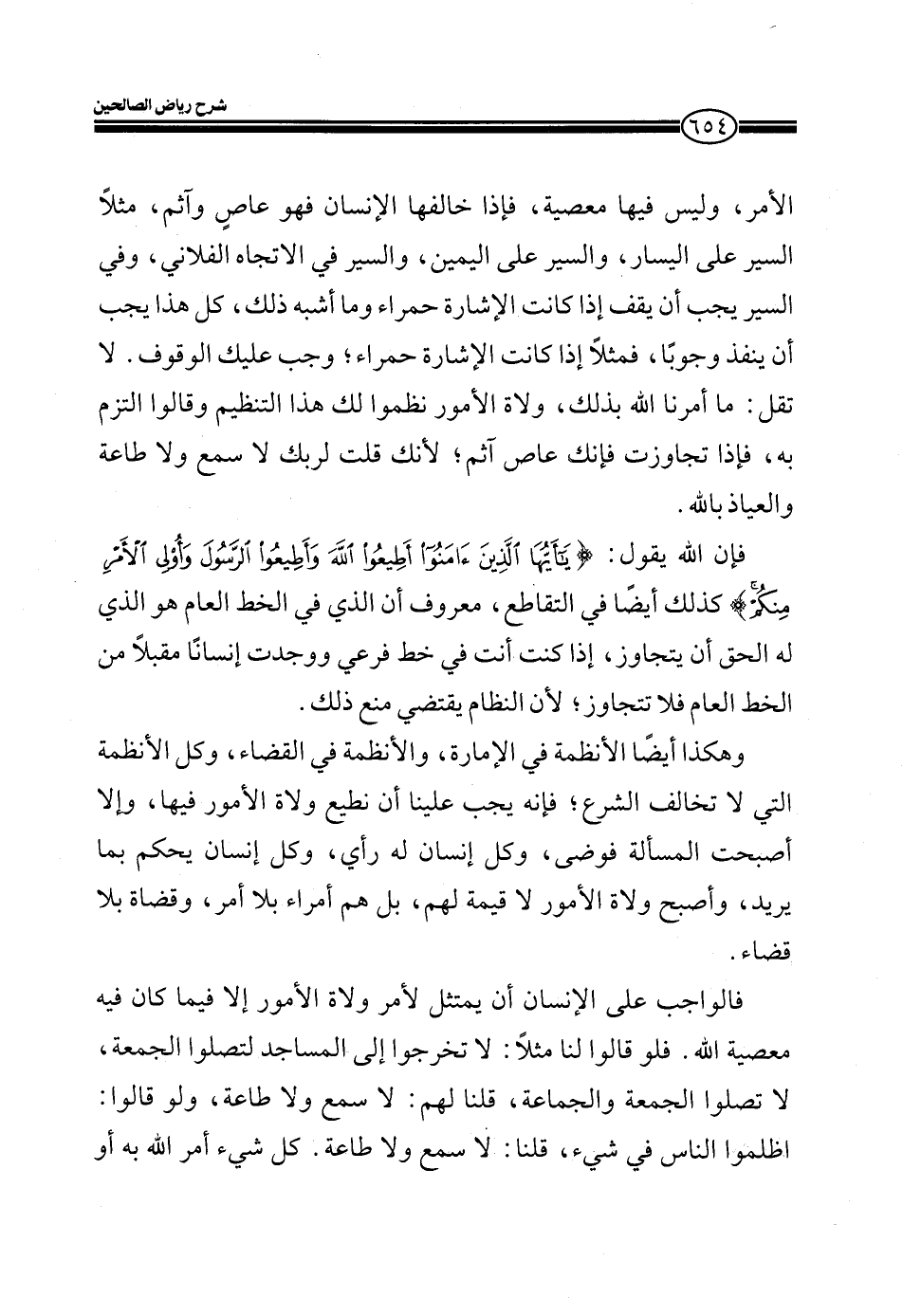 فإن الله يقول:: (يَا أَيُّهَا الَّذِينَ آمَنُوا أَطِيعُوا اللَّهَ وَأَطِيعُوا الرَّسُولَ وَأُولِي الْأَمْرِ مِنْكُمْ) كذلك أيضاً في التقاطع، معروف أن الذي في الخط العام هو الذي له الحق أن يتجاوز، إذا كنت أنت في خط فرعي ووجدت إنساناً مقبلاً من الخط العام فلا تتجاوز؛ لأن النظام يقتضي منع ذلك.
