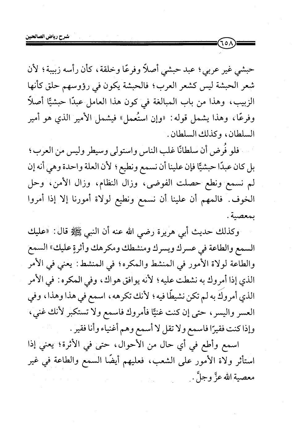 فلو فُرض أن سلطاناً غلب الناس واستولى وسيطر وليس من العرب؛ بل كان عبداً حبشياً فإن علينا أن نسمع ونطيع؛ لأن العلة واحدة وهي أنه إن لم نسمع ونطع حصلت الفوضى، وزال النظام، وزال الأمن، وحل الخوف. فالمهم أن علينا أن نسمع ونطيع لولاة أمورنا إلا إذا أمروا بمعصية.