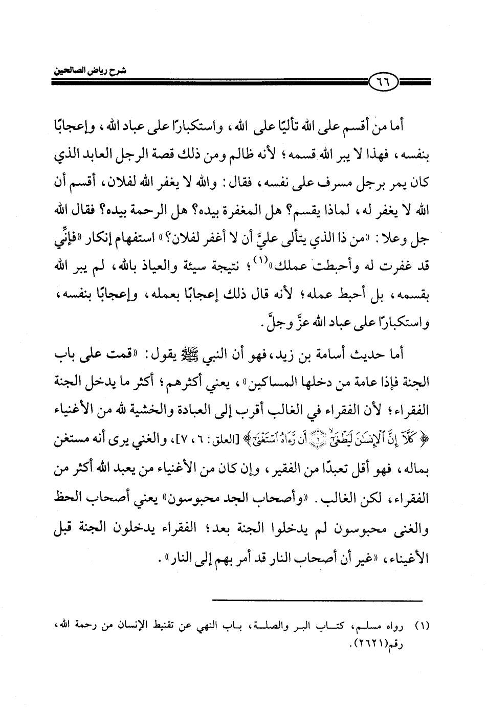 أما حديث أسامة بن زيد، فهو أن النبي صلى الله عليه وسلم يقول: ((قمت على باب الجنة فإذا عامة من دخلها المساكين)) ، يعني أكثرهم؛ أكثر ما يدخل الجنة الفقراء؛ لأن الفقراْء في الغالب أقرب إلى العبادة والخشية لله من الأغنياء (كَلَّا إِنَّ الْإنْسَانَ لَيَطْغَى أَنْ رَآهُ اسْتَغْنَى) [العلق: 6، 7] ، والغني يرى أنه مستغن بماله، فهو أقل تعبداً من الفقير، وإن كان من الأغنياء من يعبد الله أكثر من الفقراء، لكن الغالب, ((وأصحاب الجد محبوسون)) يعني أصحاب الحظ والغنى محبوسون لم يدخلوا الجنة بعد؛ الفقراء يدخلون الجنة قبل الأغنياء ((غير أن أصحاب النار قد أمر بهم إلى النار)) .