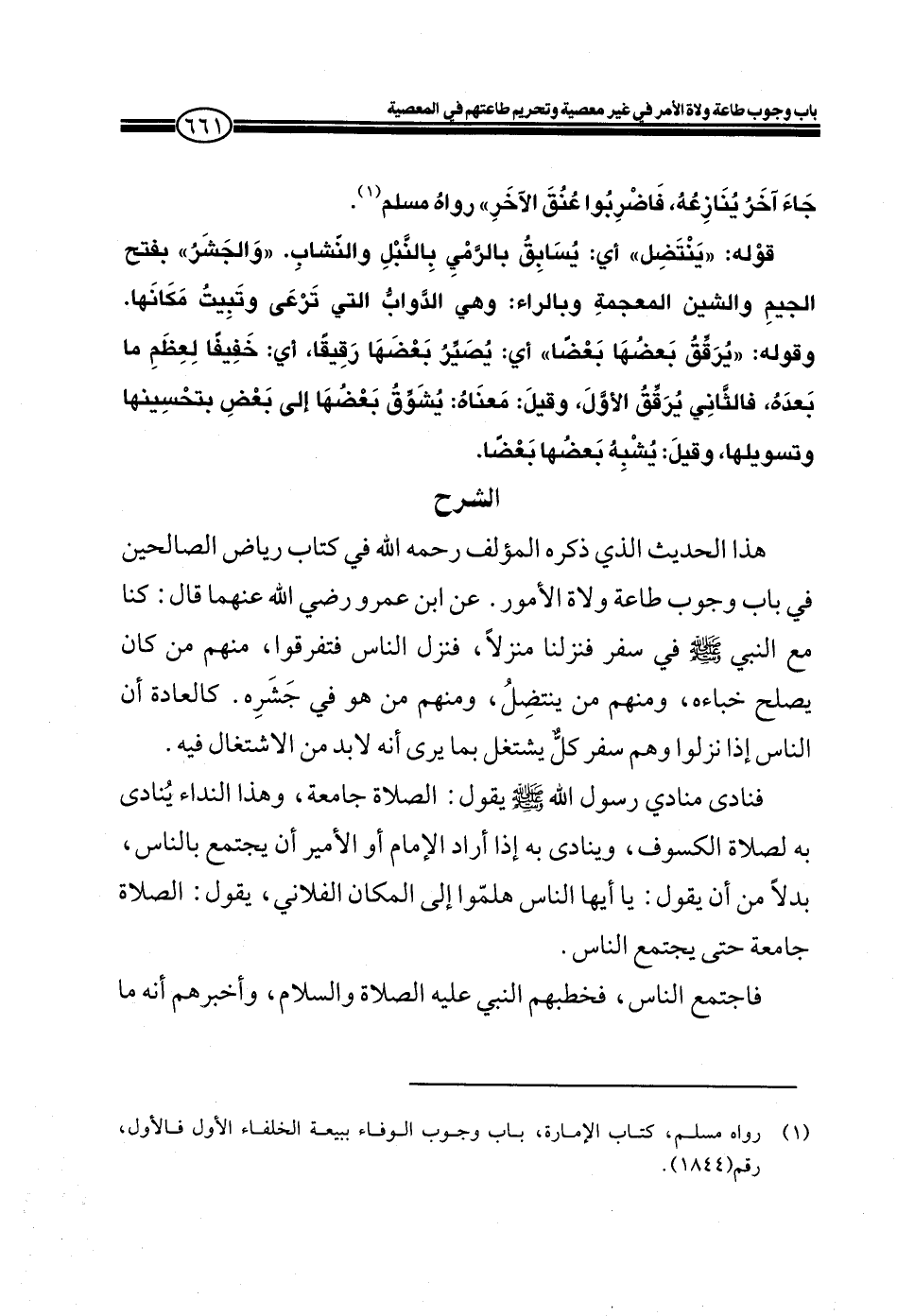 EXهذا الحديث الذي ذكره المؤلف رحمه الله في كتاب رياض الصالحين في باب وجوب طاعة ولاة الأمور. وعن ابن عمرو رضي الله عنهما قال كنا مع النبي صلى الله عليه وسلم في سفر فنزلنا منزلاً، فنزل الناس فتفرقوا، منهم من كان يصلح خباءه، ومنهم من ينتضلُ، ومنهم من هو في جشرِه. كعادة أن الناس إذا نزلوا وهم سفر كلٌّ يشتغل بما يرى أنه لابد من الاشتغال فيه.