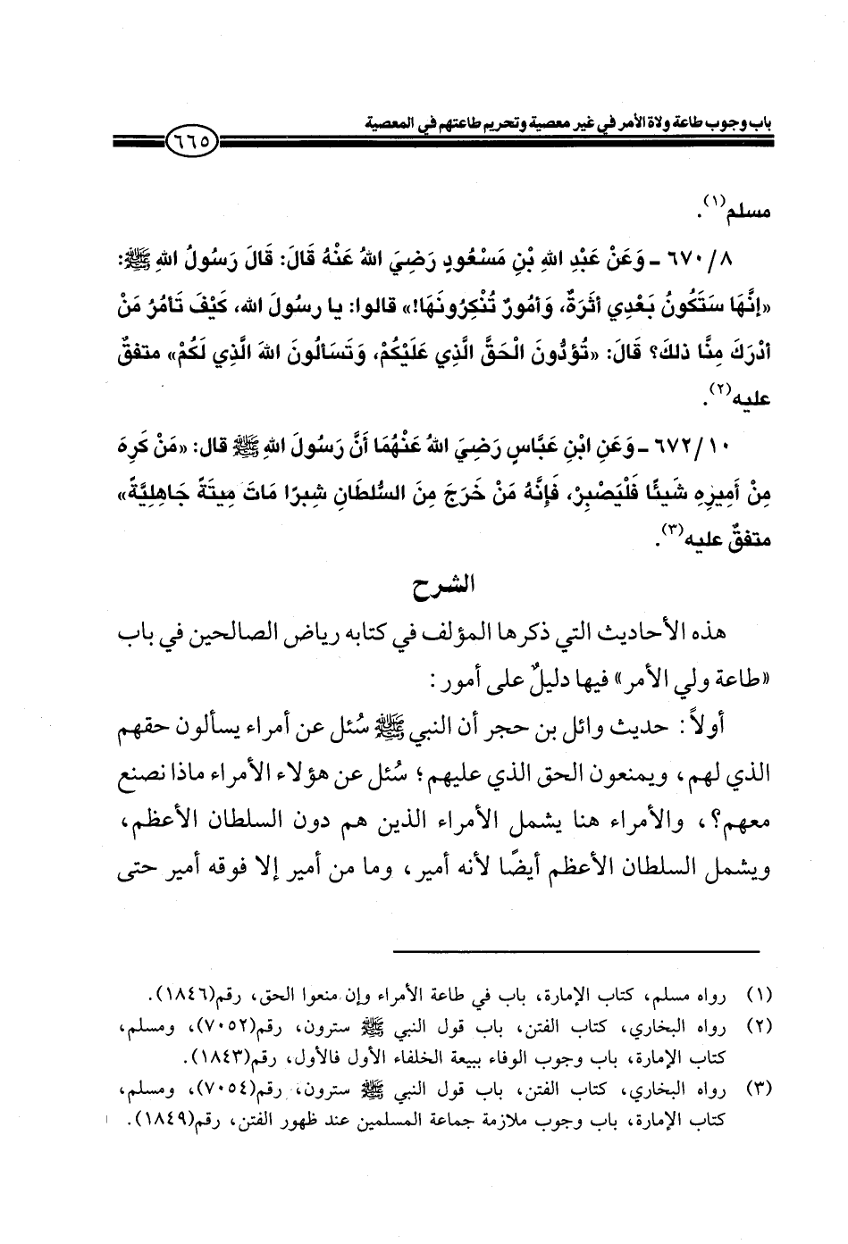 10/672- وعن ابن عباس رضي الله عنهما أن رسول الله صلى الله عليه وسلم قال: ((من كره من أميره شيئاً فليصبر، فإنه من خرج من السلطان شبراً مات ميتةً جاهلية)) متفقٌ عليه.