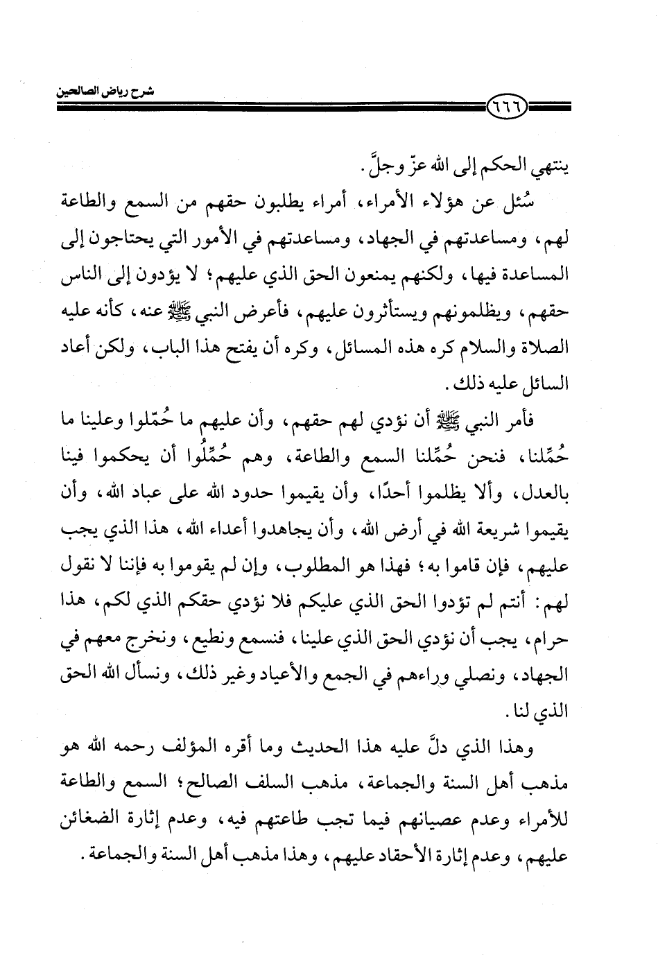 وهذا الذي دلّ عليه هذا الحديث وما أقره المؤلف رحمه الله هو مذهب أهل السنة والجماعة، مذهب السلف الصالح؛ السمع والطاعة للأمراء وعدم عصيانهم فيما تجب طاعتهم فيه، وعدم إثارة الضغائن عليهم، وعدم إثارة الأحقاد عليهم، وهذا مذهب أهل السنة والجماعة.