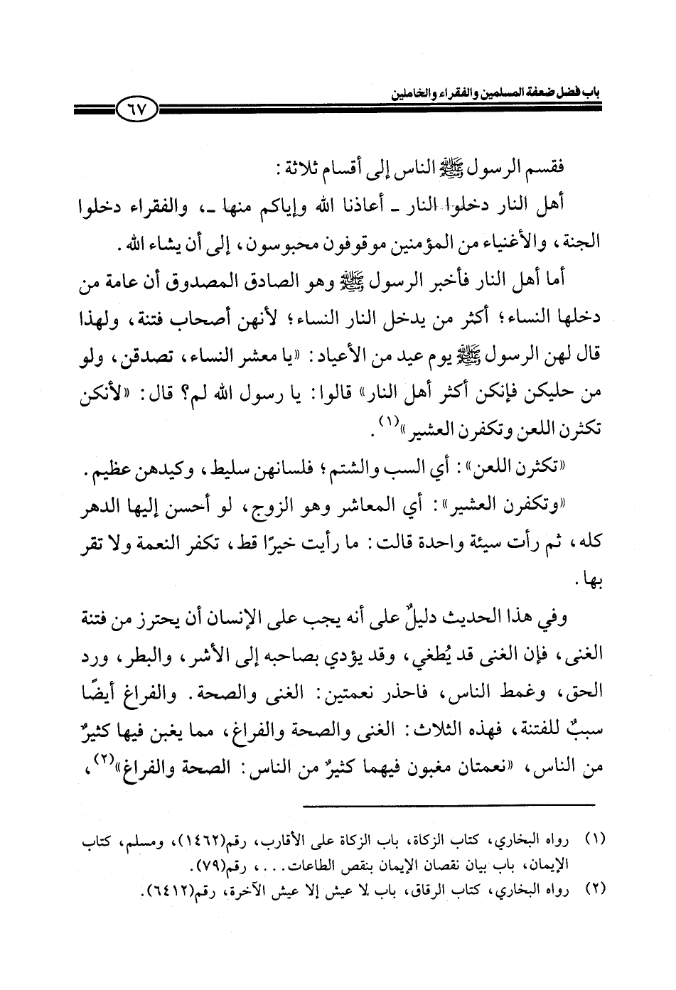 وفي هذا الحديث دليل على أنه يجب على الإنسان أن يحترز من فتنة الغنى، فإن الغنى قد يطغي، وقد يؤدي بصاحبه إلى الأشر، والبطر، ورد الحق، وغمط الناس، فاحذر نعمتين: الغنى والصحة. والفراغ أيضاً سبب للفتنة، فهذه الثلاث: الغنى والصحة. والفراغ، مما يغبن فيها كثير من الناس، ((نعمتان مغبون فيهما كثير من الناس: الصحة والفراغ)) ،