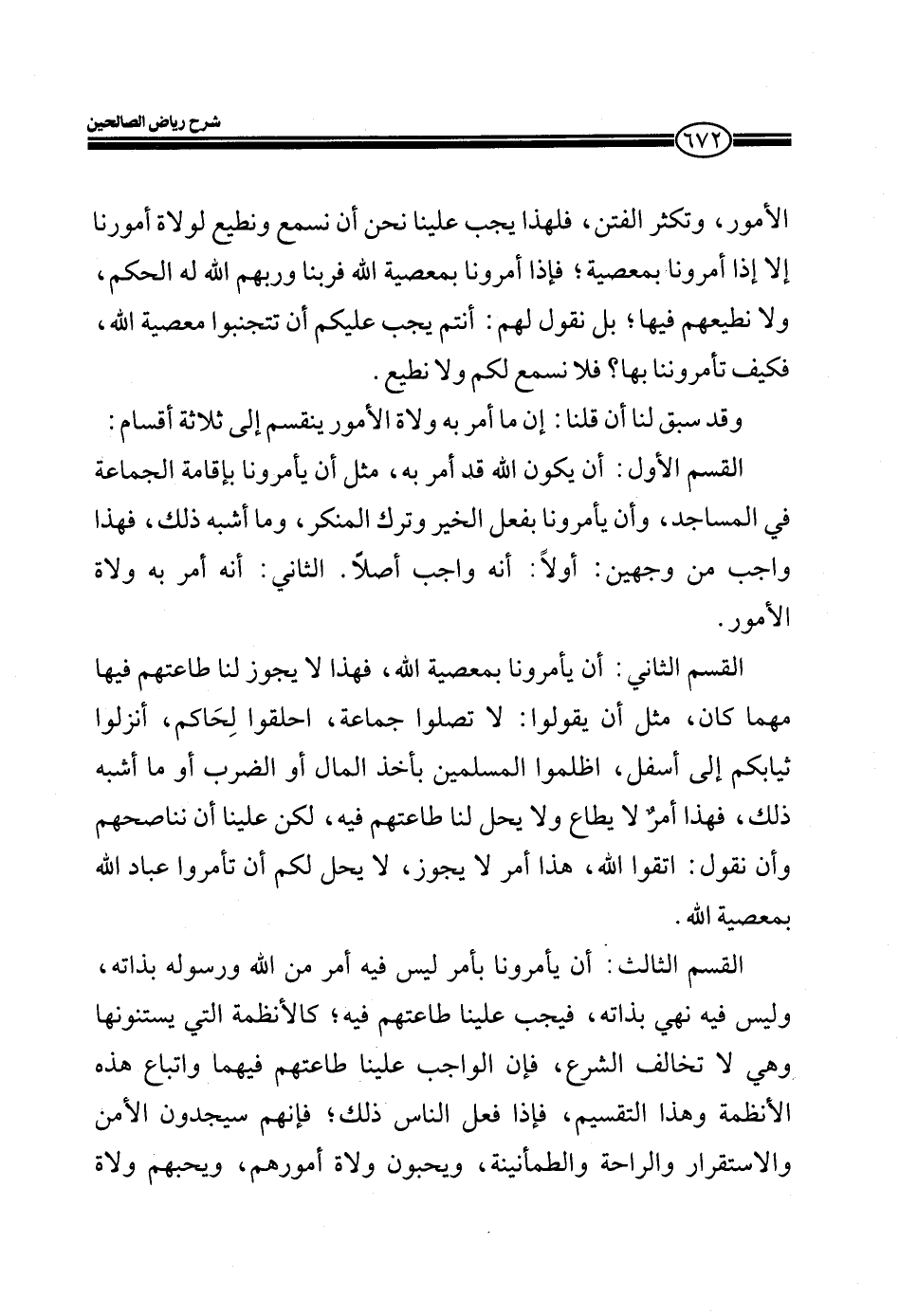 القسم الثالث: أن يأمرونا بأمر ليس فيه أمر من الله ورسوله بذاته، وليس فيه نهي بذاته، فيجب علينا طاعتهم فيه؛ كالأنظمة التي يستنونها وهي لا تخالف الشرع، فإن الواجب علينا طاعتهم فيهما واتباع هذه الأنظمة وهذا التقسيم، فإذا فعل الناس ذلك؛ فإنهم سيجدون الأمن والاستقرار والراحة والطمأنينة، ويحبون ولاة أمورهم، ويحبهم ولاة