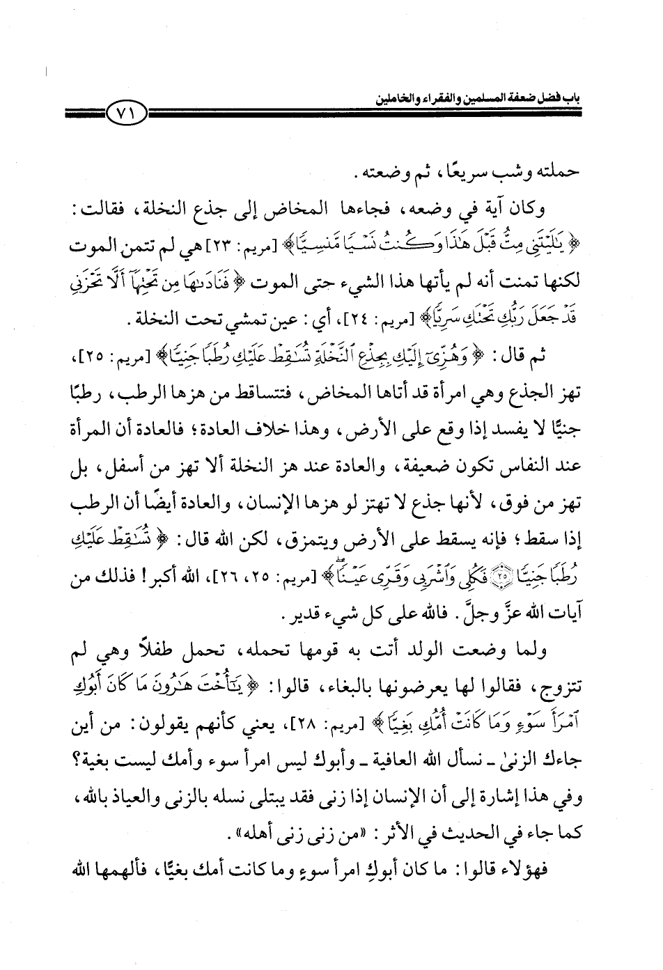 وكان آية في وضعه، فجاءها المخاض إلى جذع النخلة، فقالت: (يَا لَيْتَنِي مِتُّ قَبْلَ هَذَا وَكُنْتُ نَسْياً مَنْسِيّاً) [مريم: 23] هي لم تتمن الموت لكنها تمنت أنه لم يأتها هذا الشيء حتى الموت (فَنَادَاهَا مِنْ تَحْتِهَا أَلَّا تَحْزَنِي قَدْ جَعَلَ رَبُّكِ تَحْتَكِ سَرِيّاً) [مريم: 24] ، أي: عين تمشي تحت النخلة.