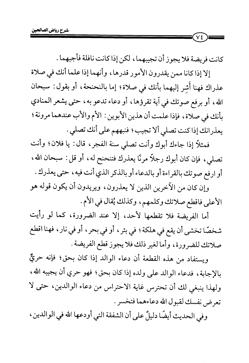 إلا إذا كانا ممن يقدرون الأمور قدرها، وأنهما إذا علما أنك في صلاة عذراك فهنا أشر إليهما بأنك في صلاة؛ إما بالنحنحة، أو بقول: سبحان الله، أو برفع صوتك في آية تقرؤها، أو دعاء تدعو به، حتى يشعر المنادي بأنك في صلاة، فإذا علمت أن هذين الأبوين: الأم والأب عندهما مرونة؛ يعذرانك إذا كنت تصلي ألا تجيب؛ فنبههم على أنك تصلي.
