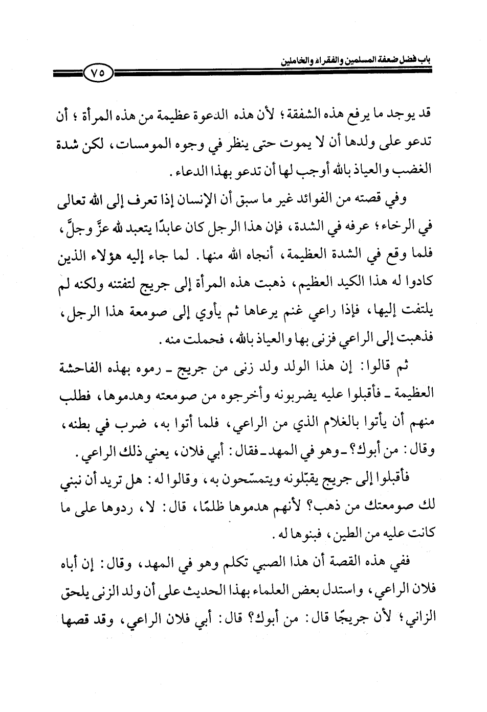 وفي قصته من الفوائد غير ما سبق أن الإنسان إذا تعرف إلى الله تعالى في الرخاء؛ عرفه في الشدة، فإن هذا الرجل كان عابداً يتعبد لله عز وجل، فلما وقع في الشدة العظيمة، أنجاه الله منها. لما جاء إليه هؤلاء الذين كادوا له هذا الكيد العظيم، ذهبت هذه المرأة إلى جريج لتفتنه ولكنه لم يلتفت إليها، فإذا راعي غنم يرعاها ثم يأوي إلى صومعة هذا الرجل، فذهبت إلى الراعي فزنى بها والعياذ بالله، فحملت منه.