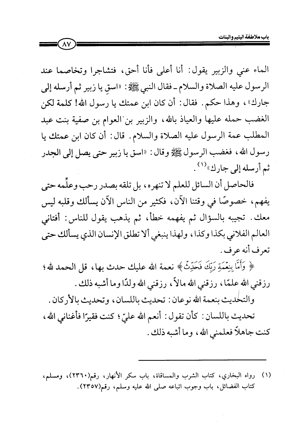 الماء عني والزبير يقول: أنا أعلى فأنا أحق، فتشاجرا وتخاصما عند الرسول عليه الصلاة والسلام ـ فقال النبي صلى الله عليه وسلم: ((اسق يا زبير ثم أرسله إلى جارك)) ، وهذا حكم. فقال: أن كان ابن عمتك يا رسول الله! كلمة لكن الغضب حمله عليها والعياذ بالله، والزبير بن العوام بن صفية بنت عبد المطلب عمة الرسول عليه الصلاة والسلام. قال: أن كان ابن عمتك يا رسول الله، فغضب الرسول صلى الله عليه وسلم وقال: ((اسق يا زبير حتى يصل إلى الجدر ثم أرسله إلى جارك))
