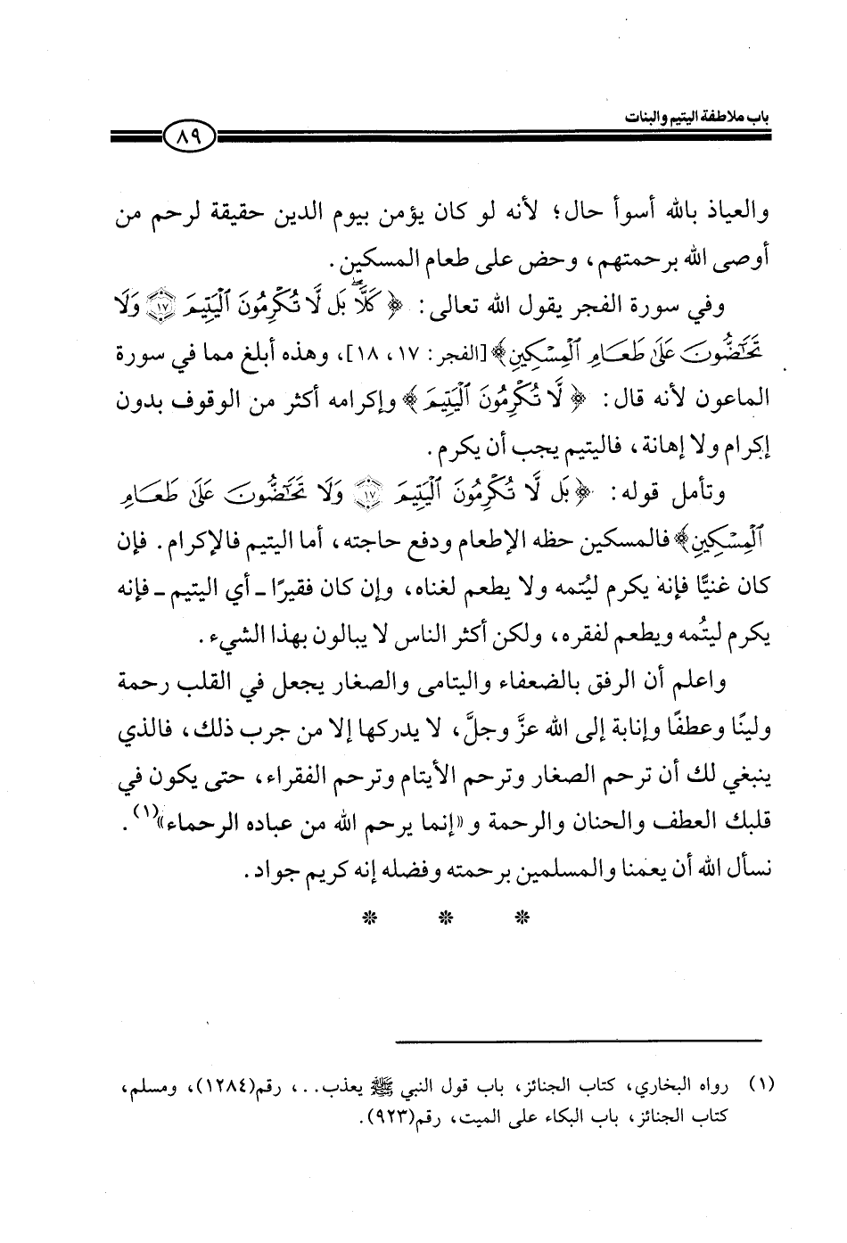 وفي سورة الفجر يقول الله تعالى: (كَلَّا بَلْ لا تُكْرِمُونَ الْيَتِيمَ وَلا تَحَاضُّونَ عَلَى طَعَامِ الْمِسْكِينِ) [الفجر: 17، 18] ، وهذه أبلغ مما في سورة الماعون لأنه قال: (لا تُكْرِمُونَ الْيَتِيمَ) وإكرامه أكثر من الوقوف بدون إكرام ولا إهانة، فاليتيم يجب أن يكرم.