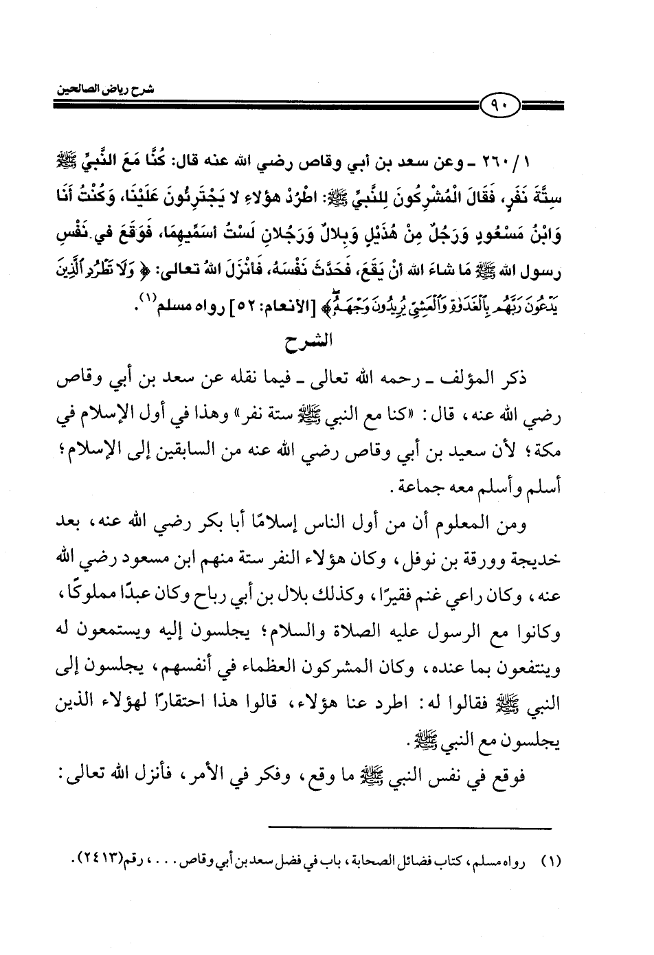 1/260 وعن سعد بن أبي وقاص رضي الله عنه قال: كنا مع النبي صلى الله عليه وسلم ستة نفر، فقال المشركون للنبي صلى الله عليه وسلم: اطرد هؤلاء لا يجترئون علينا، وكنت أنا وابن مسعود ورجل من هذيل وبلال ورجلان نسيت اسميهما، فوقع في نفس رسول الله صلى الله عليه وسلم ما شاء الله أن يقع فحدث نفسه، فانزل الله تعالى: (وَلا تَطْرُدِ الَّذِينَ يَدْعُونَ رَبَّهُمْ بِالْغَدَاةِ وَالْعَشِيِّ يُرِيدُونَ وَجْهَهُ) [الأنعام: 52] رواه مسلم