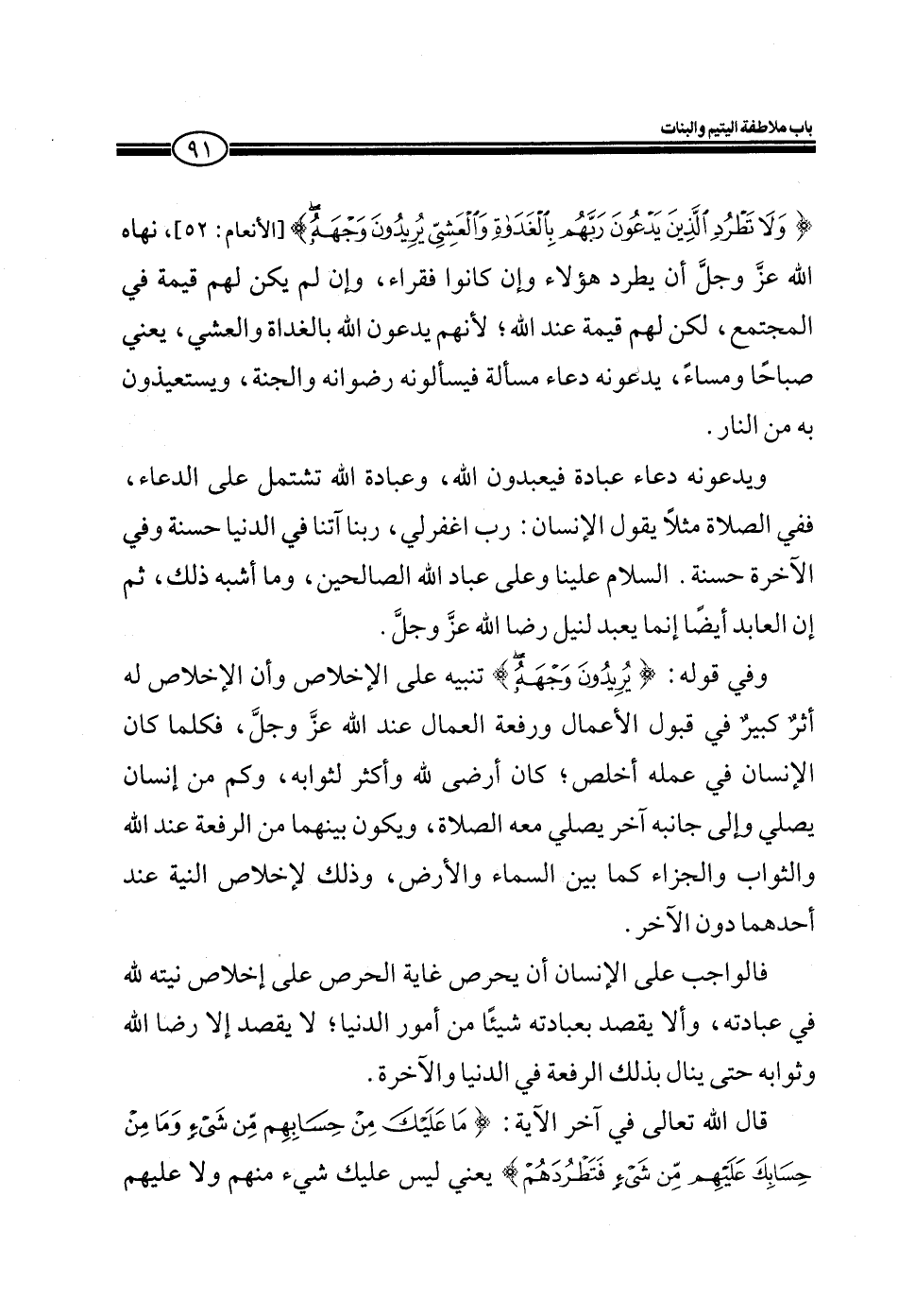 (وَلا تَطْرُدِ الَّذِينَ يَدْعُونَ رَبَّهُمْ بِالْغَدَاةِ وَالْعَشِيِّ يُرِيدُونَ وَجْهَه) [الأنعام: 52] ، نهاه الله عز وجل أن يطرد هؤلاء وإن كانوا فقراء، وإن لم يكن لهم قيمة في المجتمع، لكن لهم قيمة عند الله؛ لأنهم يدعون الله بالغداة والعشي، يعني صباحاً ومساءً، يدعونه دعاء مسألة فيسألونه رضوانه والجنة، ويستعيذون به من النار.