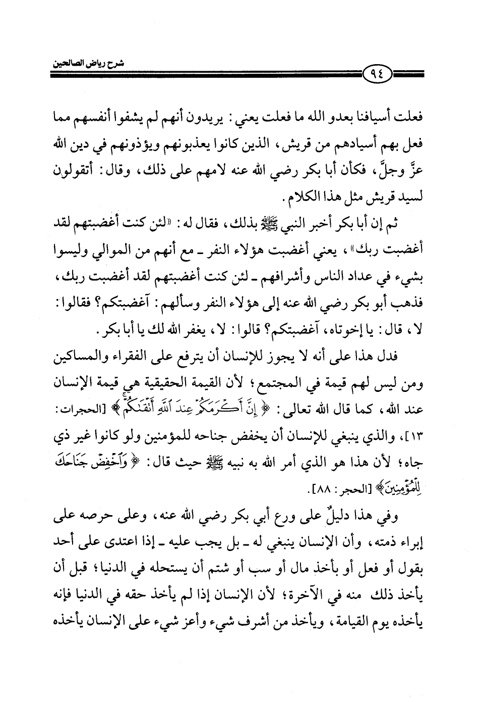 وفي هذا دليل على ورع أبي بكر رضي الله عنه، وعلى حرصه على إبراء ذمته، وأن الإنسان ينبغي له ـ بل يجب عليه ـ إذا اعتدى على أحد بقول أو فعل أو بأخذه مال أو سب أو شتم أن يستحله في الدنيا؛ قبل أن يأخذ ذلك منه في الآخرة؛ لأن الإنسان إذا لم يأخذ حقه في الدنيا فإنه يأخذه يوم القيامة، ويأخذ من أشرف شيء وأعز شيء على الإنسان يأخذه