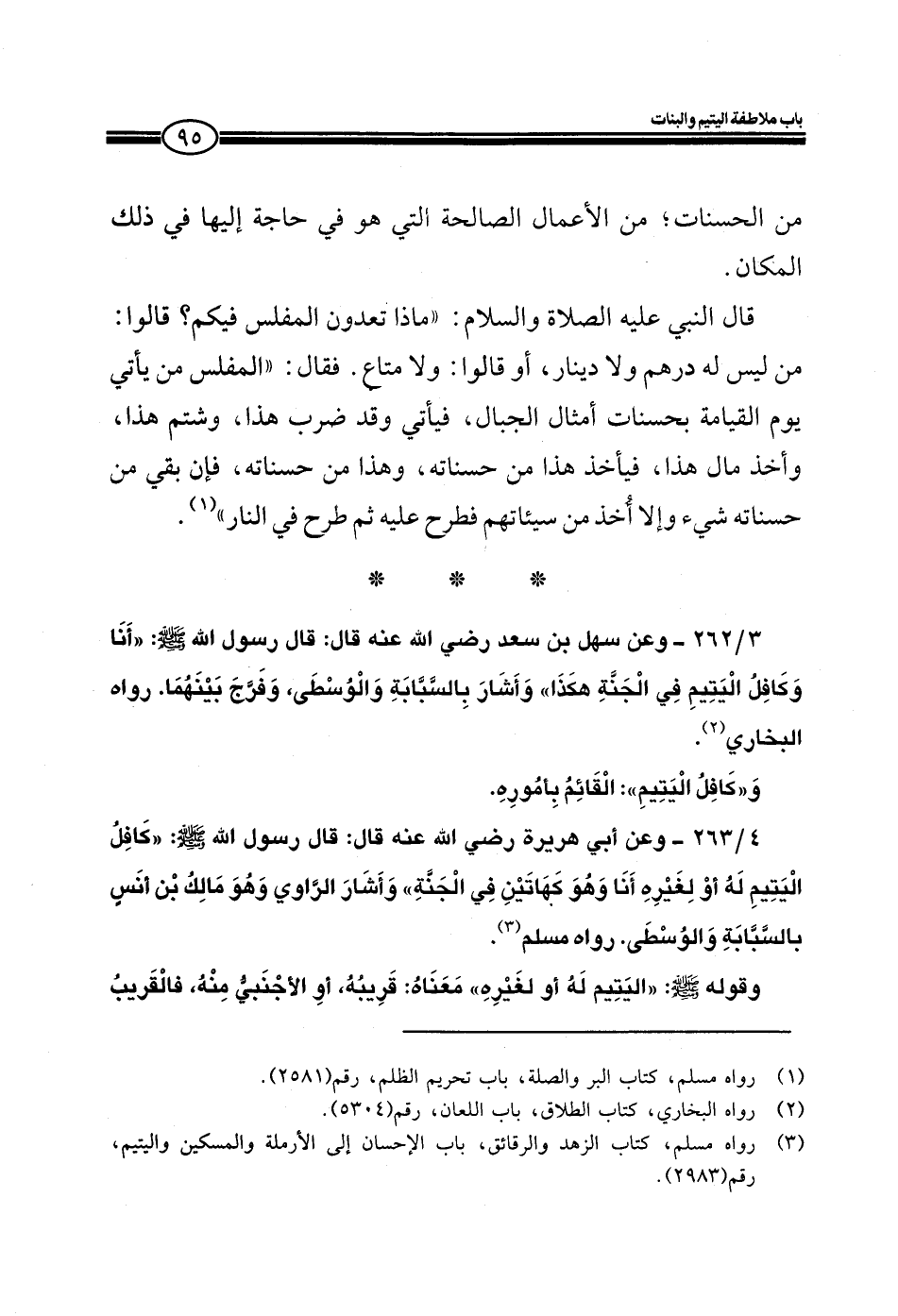 قال النبي عليه الصلاة والسلام: ((ماذا تعدون المفلس فيكم؟ قالوا: من ليس له درهم ولا دينار، أو قالوا: ولا متاع. فقال: ((المفلس من يأتي يوم القيامة بحسنات أمثال الجبال، فيأتي وقد ضرب هذا، وشتم هذا، وأخذ مال هذا، فيأخذ هذا من حسناته، وهذا من حسناته، فإن بقي من حسناته شيء وإلا أخذ من سيئاتهم فطرح عليه ثم طرح في النار)) .
