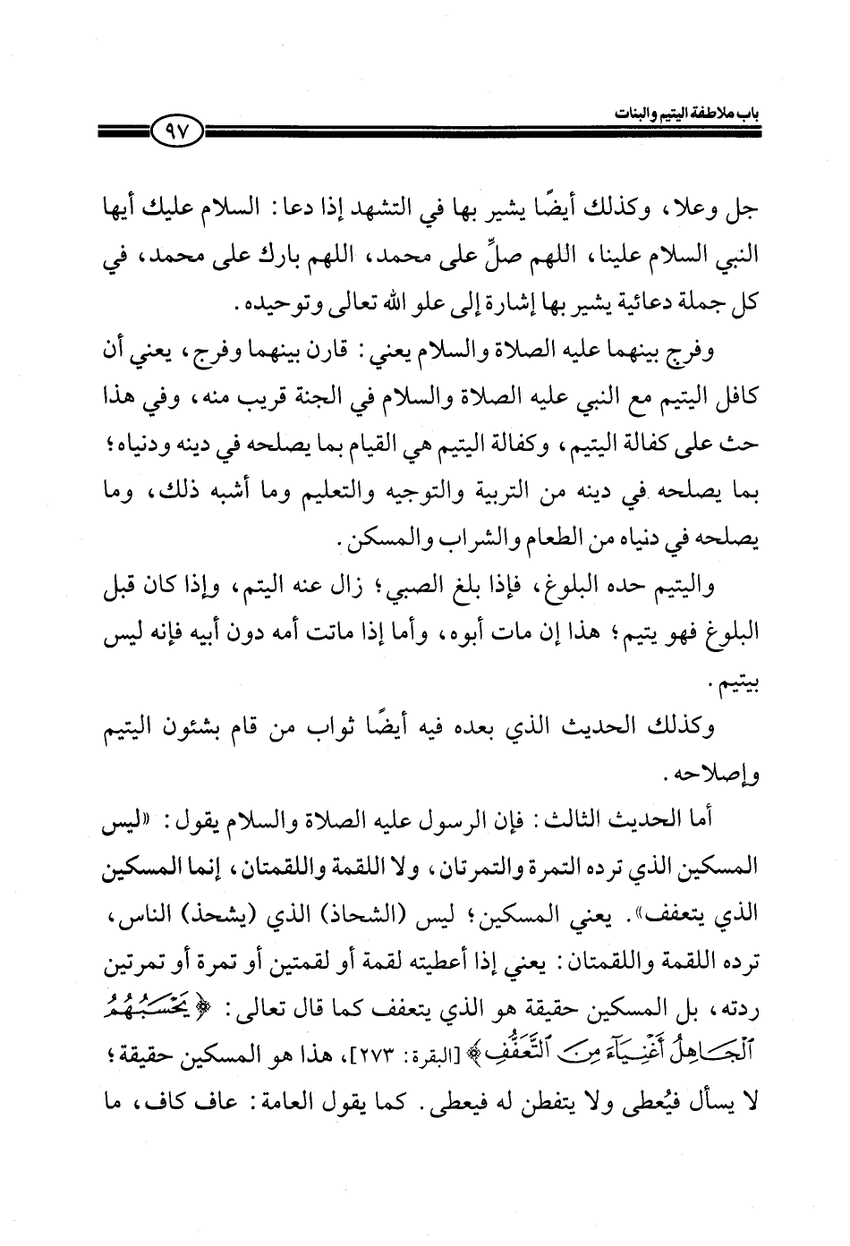 أما الحديث الثالث: فإن الرسول عليه الصلاة والسلام يقول: ((ليس المسكين الذي ترده التمرة التمرتان، ولا اللقمة واللقمتان، إنما المسكين الذي يتعفف)) . يعني المسكين؛ ليس (الشحاذ) الذي (يشحذ) الناس، ترده اللقمة واللقمتان: يعني إذا أعطيته لقمة أو لقمتين أو تمرة أو تمرتين ردته، بل المسكين حقيقة هو الذي يتعفف كما قال تعالى: (يَحْسَبُهُمُ الْجَاهِلُ أَغْنِيَاءَ مِنَ التَّعَفُّفِ) [البقرة: 273] ، هذا هو المسكين حقيقة؛ لا يسأل فيُعطى ولا يتفطن له فيعطى. كما يقول العامة: عاف كاف، ما