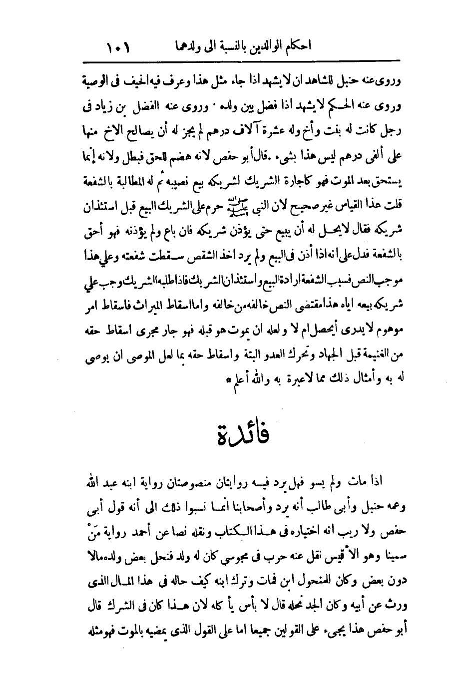 وروي عنه "للشاهد أن لا يشهد إذا جاء مثل هذا وعرف فيه الحيف في الوصية" وروى عنه الحكم "لا يشهد إذا فضل ببيت ولده" وروى عنه الفضل بن زياد في رجل كانت له بنت وأخ وله عشرة آلاف درهم لم يجز له أن يصالح الأخ منها على ألفي درهم ليس هذا بشيء قال أبو حفص: "لأنه هضم للحق فبطل ولأنه إنما يستحق بعد الموت فهو كإجازة الشريك لشريكه بيع نصبيه ثم له المطالبة بالشفعة".