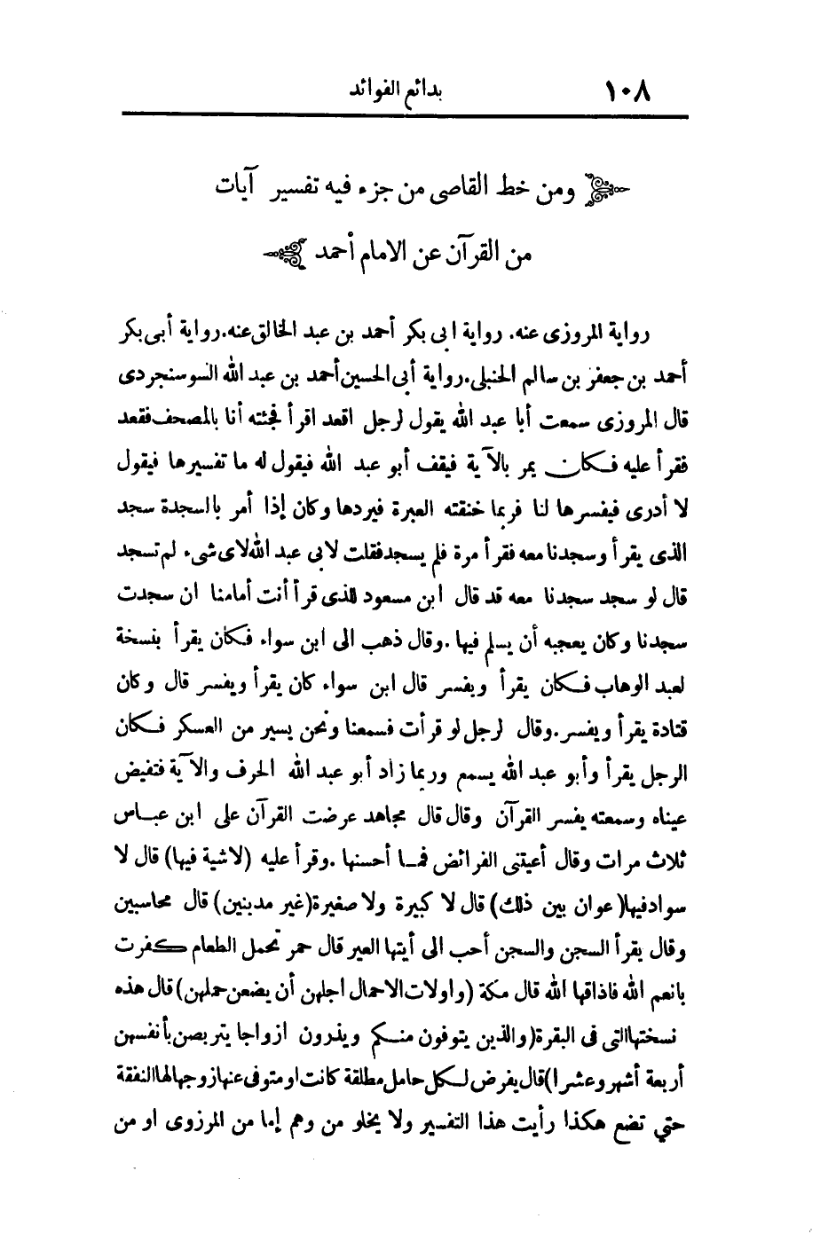 وقال: ذهب إلى ابن سواء فكان يقرأ بنسخة لعبد الوهاب فكان يقرأ ويفسر قال ابن سواء: "كان يقرأ ويفسر" قال: "وكان قتادة يقرأ ويفسر" وقال لرجل: "لو قرأت فسمعنا ونحن يسير من العسكر فكان الرجل يقرأ وأبو عبد الله يسمع وربما زاد أبو عبد الله الحرف والآية فتفيض عيناه" وسمعته يفسر القرآن وقال: "قال مجاهد: "عرضت القرآن على ابن عباس ثلاث مرات وقال: أعيتني الفرائض فما أحسنها" وقرأ عليه {لا شِيَةَ فِيهَا} قال لا سواد فيها: {عَوَانٌ بَيْنَ ذَلِكَ} قال: "لا كبيرة ولا صغيره" {غَيْرَ مَدِينِينَ} قال: "محاسبين" وقال: "يقرأ السجن والسجن أحب إلى" {أَيَّتُهَا الْعِيرُ} قال: "حمر تحمل الطعام كفرت بأنعم الله فإذاقها الله" قال تعالى: {وَأُولاتُ الأحْمَالِ أَجَلُهُنَّ أَنْ يَضَعْنَ حَمْلَهُنَّ} قال: "هذه نسختها التي في البقرة {وَالَّذِينَ يُتَوَفَّوْنَ مِنْكُمْ وَيَذَرُونَ أَزْوَاجاً يَتَرَبَّصْنَ بِأَنْفُسِهِنَّ أربعة أَشْهُرٍ وَعَشْراً} قال: "يفرض لكل حامل مطلقة كانت أو متوفى عنها زوجها لها النفقة حتى تضع" هكذا رأيت هذا التفسير ولا يخلوا من وهم إما من المروزي أو من