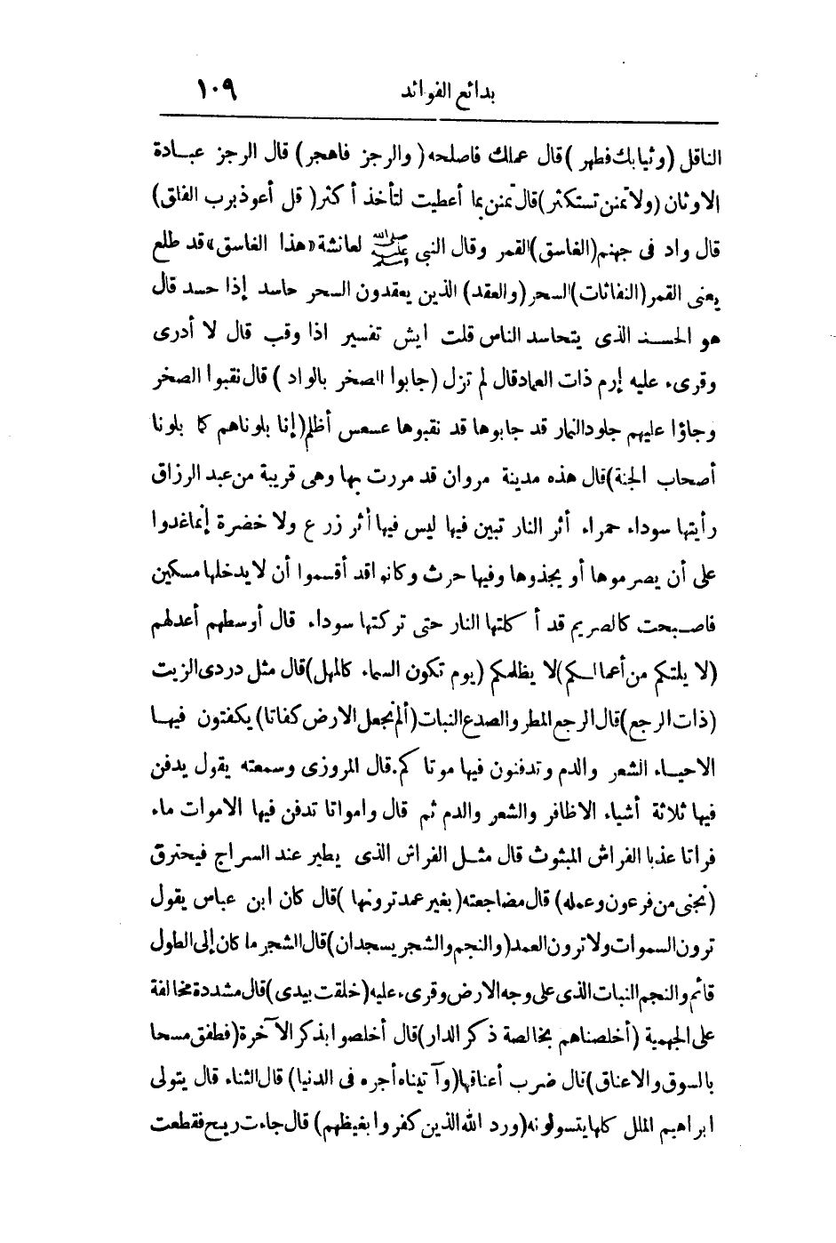 الناقل {وَثِيَابَكَ فَطَهِّرْ} قال: "عملك فأصلحه" {وَالرُّجْزَ فَاهْجُرْ} قال: "الرجز عبادة الأوثان" {وَلا تَمْنُنْ تَسْتَكْثِرُ} قال: "تمنن بما أعطيت لتأخذ أكثر {قُلْ أَعُوذُ بِرَبِّ الْفَلَقِ} قال: "واد في جهنم" (الغاسق) القمر وقال النبي صلى الله عليه وسلم: "هذا الغاسق قد طلع" يعني القمر {النَّفَّاثَاتِ} السحر و {الْعُقَدِ} الذين يعقدون السحر {حَاسِدٍ إذا حَسَدَ} قال: "هو الحسد الذي يتحاسد الناس" قلت: إيش تفسير {إذا وَقَبَ} قال: "لا أدري" وقرىء عليه {إِرَمَ ذَاتِ الْعِمَادِ} قال:"لم تزل" {جَابُوا الصَّخْرَ بِالْوَادِ} قال: "نقبوا الصخر وجاءوا عليهم جلود النمار قد جابوها قد نقبوها" {عَسْعَسَ} أظلم: {إِنَّا بَلَوْنَاهُمْ كَمَا بَلَوْنَا أَصْحَابَ الْجَنَّةِ} قال: "هذه مدينه مروان قد مررت بها وهي قريبة من عبد الرزاق رأيتها سوداء حمراء أثر النار تبين فيها ليس فيها أثر زرع ولا خضرة إنما غدوا على أن يصرموها أو يجدوها وفيها حرث وكانوا قد أقسموا أن لا يدخلها مسكين {فَأَصْبَحَتْ كَالصَّرِيمِ} قد أكلتها النار حتى تركتها سوداء {قَالَ أَوْسَطُهُمْ} أعدلهم {لا يَلِتْكُمْ مِنْ أَعْمَالِكُمْ} لا يظلمكم {يَوْمَ تَكُونُ السَّمَاءُ كَالْمُهْلِ} قال: "مثل دردري الزيت" {ذَاتِ الرَّجْعِ} قال: "الرجع: المطر" والصدع: النبات {أَلَمْ نَجْعَلِ الأرض كِفَاتاً} يكفتون فيها الأحياء الشعر والدم وتدفنون فيها موتاكم قال المروزي وسمعته يقول: "يدفن فيها ثلاثة أشياء الأظافر والشعر والدم" ثم قال {وَأَمْوَاتاً} تدفن فيها الأموات {مَاءً فُرَاتاً} عذبا (الفراش المبثوث) قال: الفراش الذي يطير عند السراج فيحترق {وَنَجِّنِي مِنْ فِرْعَوْنَ وَعَمَلِهِ} قال: "مضاجعته" {بِغَيْرِ عَمَدٍ تَرَوْنَهَا} قال: "كان ابن عباس يقول ترون السماوات ولا ترون العمد {وَالنَّجْمُ وَالشَّجَرُ يَسْجُدَانِ} قال: "الشجر ما كان إلى طول قائم والنجم النبات الذي على وجه الأرض" وقرىء عليه: {خَلَقْتُ بِيَدَيَّ} قال: "مشددة مخالفة على الجهمية {أَخْلَصْنَاهُمْ بِخَالِصَةٍ ذِكْرَى الدَّارِ} قال: "أخلصوا بذكر الآخرة" {فَطَفِقَ مَسْحاً بِالسُّوقِ وَالأعْنَاقِ} قال: "ضرب أعناقها" {وَآتَيْنَاهُ أَجْرَهُ فِي الدُّنْيَا} قال: "الثناء يتولى إبراهيم الملل كلها يتسولونه {وَرَدَّ اللَّهُ الَّذِينَ كَفَرُوا بِغَيْظِهِمْ} قال: "جاءت ريح فقطعت