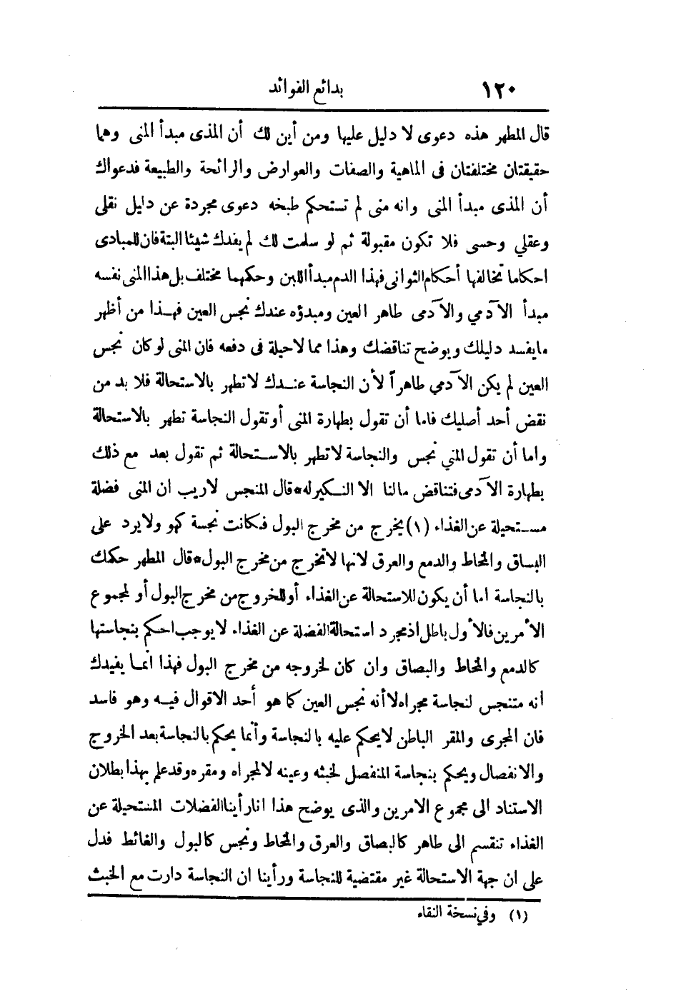 قال المطهر: حكمك بالنجاسة إما أن يكون للاستحالة عن الغذاء أو للخروج من مخرج البول أو لمجموع الأمرين فالأول باطل إذ مجرد استحالة الفضلة عن الغذاء لا يوجب الحكم بنجاستها كالدمع والمخاط والبصاق وإن كان لخروجه من مخرج البول فهذا إنما يفيدك أنه متنجس لنجاسة مجراه لا أنه نجس العين كما هو أحد الأقوال فيه وهو فاسد فإن المجرى والمقر الباطن لا يحكم عليه بالنجاسة وإنما يحكم بالنجاسة بعد الخروج والانفصال ويحكم بنجاسة المنفصل لخبثه وعينه لا لمجراه مقره وقد علم بهذا بطلان الاستناد إلى مجموع الأمرين والذي يوضح هذا أنا رأينا الفضلات المستحلة عن الغذاء تنقسم إلى طاهر كالبصاق والعرق والمخاط ونجس كالبول والغائط فدل على أن جهة الاستحالة غير مقتضية للنجاسة ورأينا أن النجاسة دارت مع الخبث