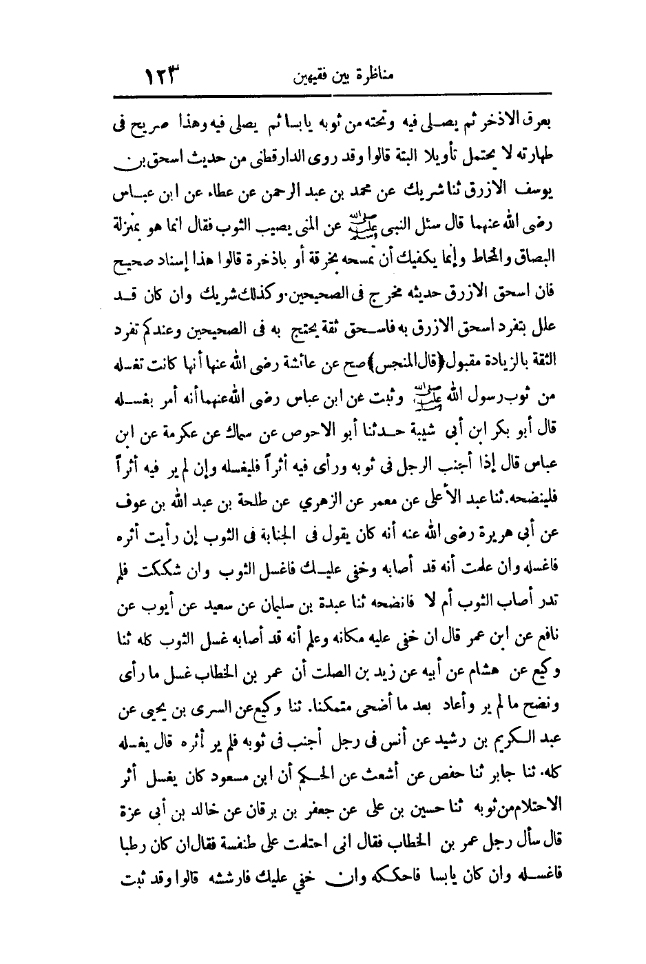 قالوا: وقد روى الدارقطني من حديث إسحاق بن يوسف الأزرق ثنا شريك عن محمد ابن عبد الرحمن عن عطاء عن ابن عباس رضي الله عنهما قال: " سئل النبي صلى الله عليه وسلم عن المني يصيب الثوب؟ فقال: "إنما هو بمنزلة البصاق والمخاط وإنما يكفيك أن تمسحه بخرقة أو بإذخرة" قالوا: هذا إسناد صحيح فإن إسحاق الأزرق حديثه مخرج في الصحيحين وكذلك شريك وإن كان قد علل بتفرد إسحاق الأزرق به فإسحاق ثقة يحتج به في الصحيحين وعندكم تفرد الثقة بالزيادة مقبول.