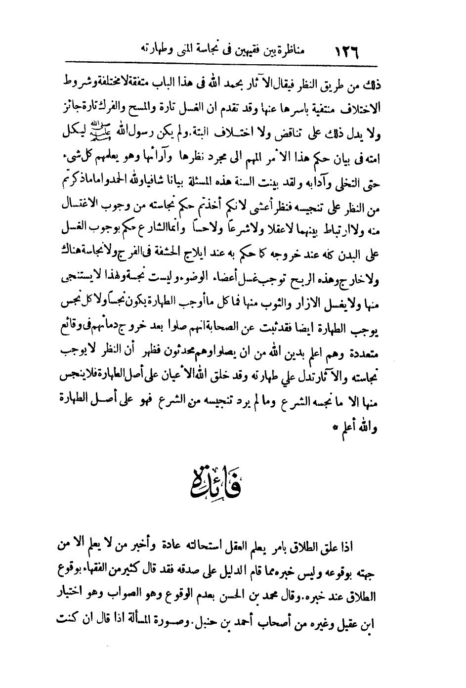 ذلك من طريق النظر فيقال الآثار بحمد الله في هذا الباب متفقة لا مختلفة وشروط الاختلاف منتفية بأسرها عنها وقد تقدم أن الغسل تارة والمسح والفرك تارة جائز ولا يدل ذلك على تناقض ولا اختلاف البتة ولم يكن رسول الله صلى الله عليه وسلم ليكل أمته في بيان حكم هذا الأمر المهم إلى مجرد نظرها وآرائها وهو يعلمهم كل شيء حتى التخلي وآدابه ولقد بينت السنة هذه المسألة بيانا شافيا ولله الحمد.