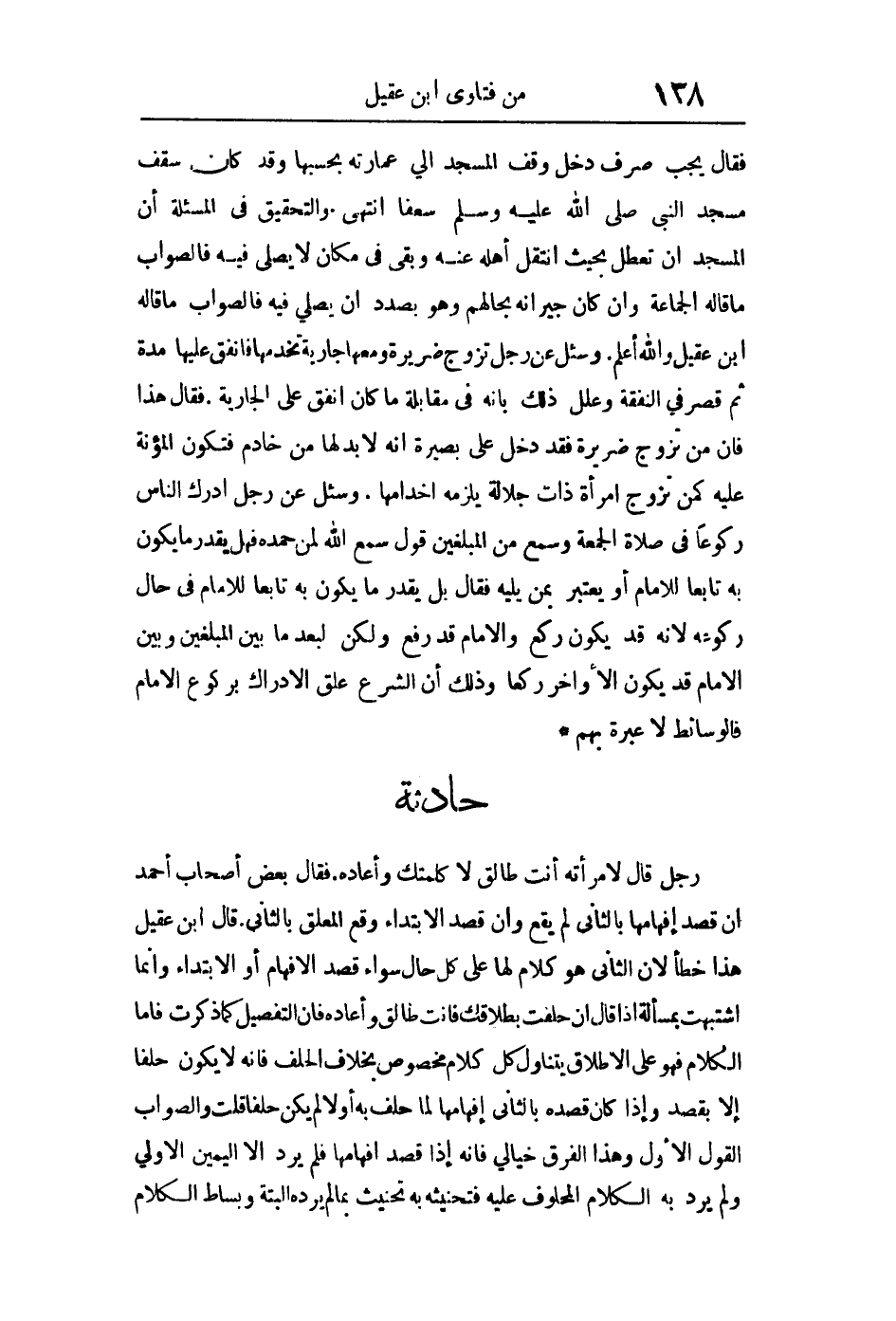 فقال "يجب صرف دخل وقف المسجد إلى عمارته بحسبها وقد كان سقف مسجد النبي صلى الله عليه وسلم سعفا" أنتهي.