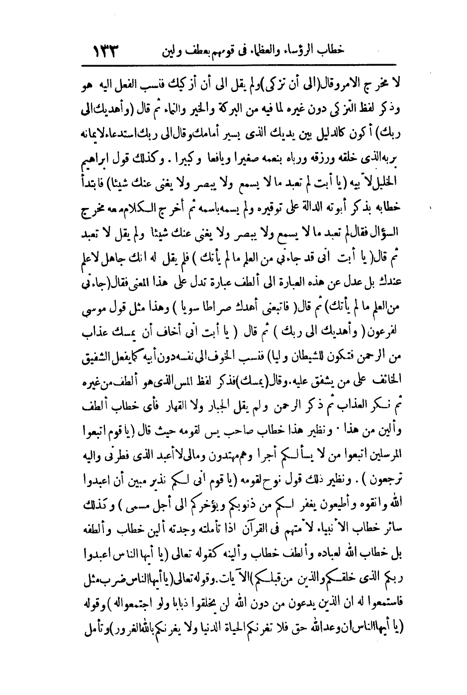 لا مخرج الأمر وقال: {إِلَى أَنْ تَزَكَّى} ولم يقل إلى أن أزكيك فنسب الفعل إليه هو وذكر لفظ التزكي دون غيره لما فيه من البركة والخير والنماء ثم قال {وَأَهْدِيَكَ إِلَى رَبِّكَ} أكون كالدليل بين يديك الذي يسير أمامك وقال {إِلَى رَبِّكَ} استدعاء لإيمانه بربه الذي خلقه ورزقه ورباه بنعمه صغيرا ويافعا وكبيرا وكذلك قول إبراهيم الخليل لأبيه {يَا أَبَتِ لِمَ تَعْبُدُ مَا لا يَسْمَعُ وَلا يُبْصِرُ وَلا يُغْنِي عَنْكَ شَيْئاً} فابتدأ خطابه بذكر أبوته الدالة على توقيره ولم يسمه باسمه ثم اخرج الكلام معه مخرج السؤال فقال: {لِمَ تَعْبُدُ مَا لا يَسْمَعُ وَلا يُبْصِرُ وَلا يُغْنِي عَنْكَ شَيْئاً} ولم يقل لا تعبد ثم قال: {يَا أَبَتِ إِنِّي قَدْ جَاءَنِي مِنَ الْعِلْمِ مَا لَمْ يَأْتِكَ} فلم يقل له جاهل لا علم عندك بل عدل عن هذه العبارة إلى ألطف عبارة تدل على هذا المعنى فقال: {جَاءَنِي مِنَ الْعِلْمِ مَا لَمْ يَأْتِكَ} ثم قال: {فَاتَّبِعْنِي أَهْدِكَ صِرَاطاً سَوِيّاً} هذا ومثل قول موسى لفرعون: {وَأَهْدِيَكَ إِلَى رَبِّكَ} ثم قال: {يَا أَبَتِ إِنِّي أَخَافُ أَنْ يَمَسَّكَ عَذَابٌ مِنَ الرَّحْمَنِ فَتَكُونَ لِلشَّيْطَانِ وَلِيّاً} فنسب الخوف إلى نفسه دون أبيه كما يفعل الشفيق الخائف على من يشفق عليه وقال: (يمسك) فذكر لفظ المس الذي هو ألطف من غيره ثم نكر العذاب ثم ذكر الرحمن ولم يقل الجبار ولا القهار فأي خطاب ألطف وألين من هذا. ونظير هذا خطاب صاحب يس لقومه حيث قال: {يَا قَوْمِ اتَّبِعُوا الْمُرْسَلِينَ اتَّبِعُوا مَنْ لا يَسْأَلُكُمْ أَجْراً وَهُمْ مُهْتَدُونَ وَمَا لِيَ لا أَعْبُدُ الَّذِي فَطَرَنِي وَإِلَيْهِ تُرْجَعُونَ} ونظير ذلك قول نوح لقومه: {يَا قَوْمِ إِنِّي لَكُمْ نَذِيرٌ مُبِينٌ أَنِ اعْبُدُوا اللَّهَ وَاتَّقُوهُ وَأَطِيعُونِ يَغْفِرْ لَكُمْ مِنْ ذُنُوبِكُمْ وَيُؤَخِّرْكُمْ إِلَى أَجَلٍ مُسَمّى} .
