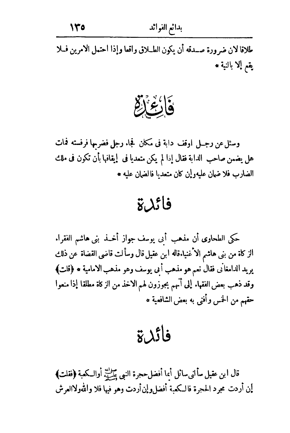 فائدة: وسئل عن رجل أوقف دابة في مكان فجاء رجل فضربها فرفسته فمات هل يضمن صاحب الدابة؟ فقال: "إذا لم يكن متعديا في إيقافها بأن تكون في ملك الضارب فلا ضمان عليه وإن كان متعديا فالضمان عليه".