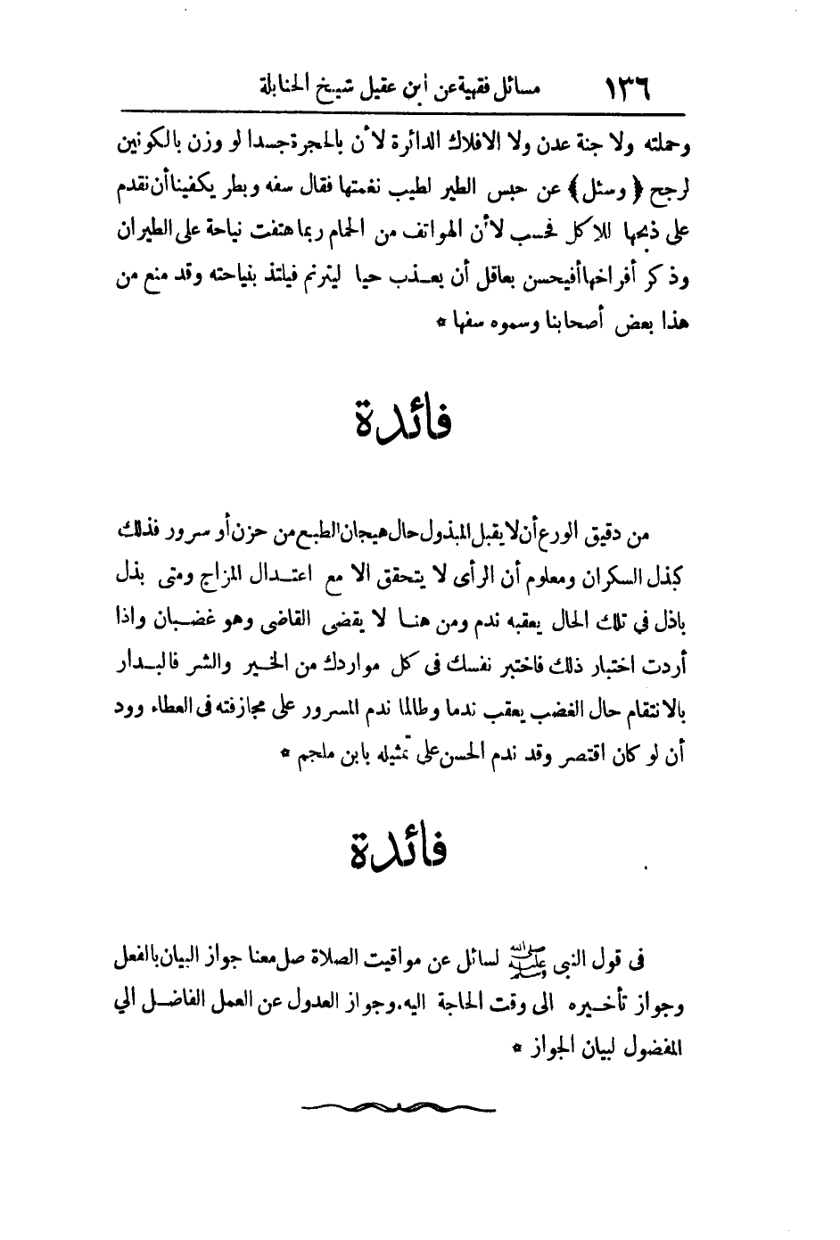 فائدة: من دقيق الورع أن لا يقبل المبذول حال هيجان الطبع من حزن أو سرور فذلك كبذل السكران ومعلوم أن الرأي لا يتحقق إلا مع اعتدال المزاج ومتى بذل باذل في تلك الحال يعقبه ندم ومن هنا لا يقضي القاضي وهو غضبان وإذا أردت اختبار ذلك فاختبر نفسك في كل مواردك من الخير والشر فالبدار بالانتقام حال الغضب يعقب ندما وطالما ندم المسرور على مجازفته في العطاء وود أن لو كان اقتصر وقد ندم الحسن على تمثيله بابن ملجم.