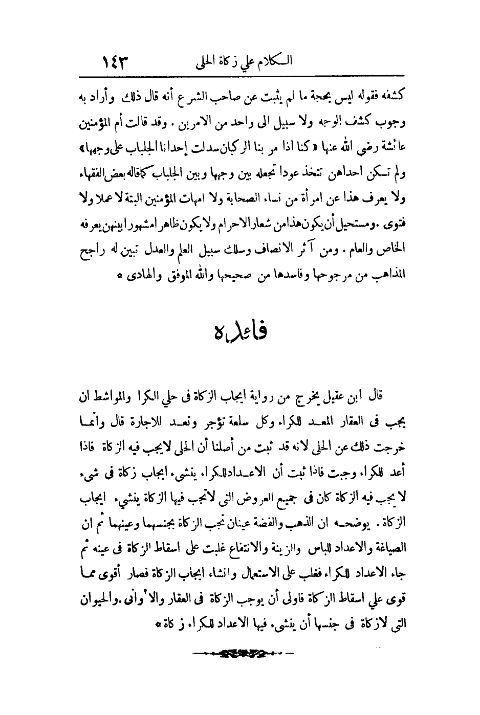 قال ابن عقيل: "يخرج من رواية إيجاب الزكاة في حلي الكراء والمواشط أن يجب في العقار المعد للكراء وكل سلعة تؤجر وتعد للإجارة" قال: "وإنما خرجت ذلك عن الحلي لأنه قد ثبت من أصلنا أن الحلي لا يجب فيه الزكاة فإذا أعد للكراء وجبت جميع العروض التي لا تجب فيها الزكاة ينشىء إيجاب الزكاة يوضحه أن الذهاب والفضة عينان تجب الزكاة بجنسهما وعينهما ثم إن الصياغة والإعداد للباس والزينة والانتفاع غلبت على إسقاط الزكاة في عينه ثم جاء الإعداد للكراء فغلب على الاستعمال وإنشاء إيجاب الزكاة فصار أقوى مما قوى على إسقاط الزكاة فأولى أن يوجب الزكاة في العقار والأواني والحيوان التي لا زكاة في جنسها أن ينشيء فيها الإعداد للكراء زكاة".