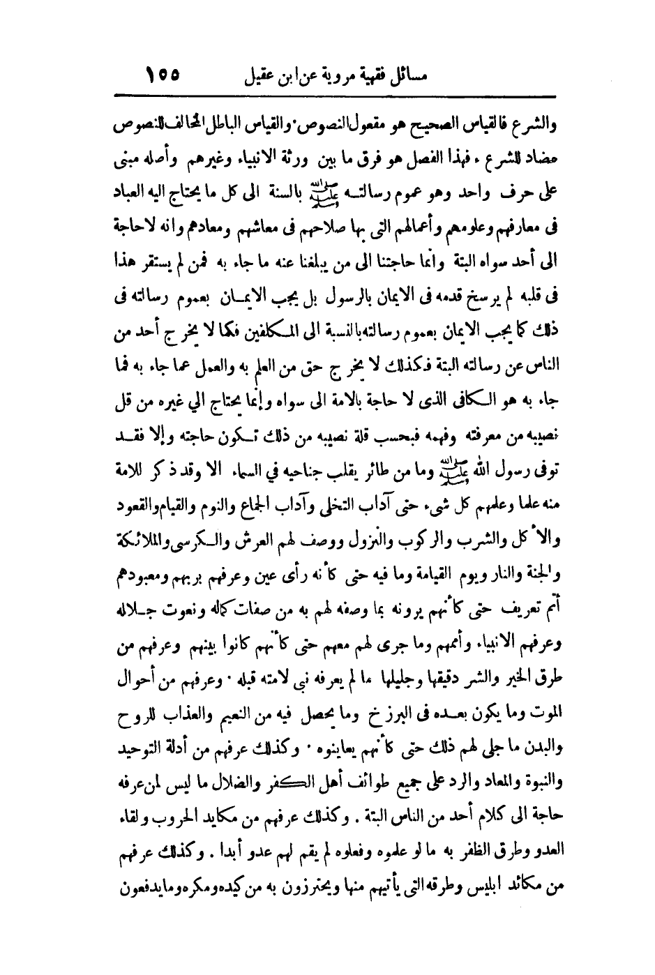 والشرع فالقياس الصحيح هو معقول النصوص والقياس الباطل المخالف للنصوص مضاد للشرع فهذا الفصل هو فرق ما بين ورثه الأنبياء وغيرهم وأصله مبني على حرف واحد وهو عموم رسالته بالسنة إلى كل ما يحتاج إليه العباد في معارفهم وعلومهم وأعمالهم التي بها صلاحهم في معاشهم ومعادهم وأنه لا حاجة إلى أحد سواه البتة وإنما حاجتنا إلى من يبلغنا عنه ما جاء به فمن لم يستقر هذا في قلبه لم يرسخ قدمه في الإيمان بالرسول بل يجب الإيمان بعموم رسالته في ذلك كما يجب الإيمان بعموم رسالته بالنسبة إلى المكلفين فكما لا يخرج أحد من الناس عن رسالته البتة فكذلك لا يخرج حق من العلم به والعمل عما جاء به فما جاء به هو الكافي الذي لا حاجة بالأمة إلى سواه وإنما يحتاج إلى غيره من قبل نصيبه من معرفته وفهمه فبحسب قلة نصيبه من ذلك تكون حاجته وإلا فقد توفي رسول الله صلى الله عليه وسلم وما من طائر يقلب جناحيه في السماء إلا وقد ذكر للأمة منه علما وعلمهم كل شيء حتى آداب التخلي وآداب الجماع والنوم والقعود والأكل والشرب والركوب والنزول ووصف لهم وآداب العرش والكرسي والملائكة والجنة والنار ويوم القيامة وما فيه حتى كأنه رأي عين وعرفهم بربهم ومعبودهم أتم تعريف حتى كأنهم يرونه بما وصفه لهم به من صفات كماله ونعوت جلاله وعرفهم الأنبياء وأممهم وما جرى لهم معهم حتى كأنهم كانوا بينهم وعرفهم من طرق الخير والشر دقيقها وجليلها ما لم يعرفه نبي لأمته قبله، وعرفهم من أحوال الموت وما يكون بعده في البرزخ وما يحصل فيه من النعيم والعذاب للروح والبدن ما جلى لهم ذلك حتى كأنهم يعاينوه، وكذلك عرفهم من أدلة التوحيد والنبوة والمعاد والرد على جميع طوائف أهل الكفر والضلال ما ليس لمن عرفه إلى كلام أحد من الناس البتة، وكذلك عرفهم من مكايد الحروب ولقاء العدو وطرق الظفر به ما لو علموه وفعلوه لم يقم لهم عدوا أبدا، وكذلك عرفهم من مكائد إبليس طرقه التي يأتيهم منها ويحترزون به من كيده ومكره وما يدفعون