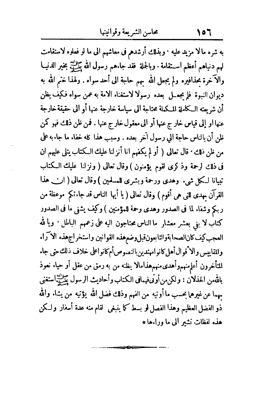 به شره مالا مزيد عليه وبذلك أرشدهم في معاشهم إلى ما لو فعلوه لاستقامت لهم دنياهم أعظم استقامة وبالجملة فقد جاءهم رسول الله بخير الدنيا والآخرة بحذافيره ولم يجعل الله بهم حاجة إلى أحد سواه ولهذا ختم الله به ديوان النبوة فلم يجعل بعده رسولا لاستغناء الأمة به عمن سواه فكيف يظن أن شريعته الكاملة المكملة محتاجة إلى سياسة خارجه عنها أو إلى حقيقة خارجه عنها أو إلى قياس خارج عنها أو إلى معقول خارج عنها فمن ظن ذلك فهو كمن ظن أن بالناس حاجة إلى رسول آخر بعده وسبب هذا كله خفاء ما جاء به على من ظن ذلك قال تعالى: {أَوَلَمْ يَكْفِهِمْ أَنَّا أَنْزَلْنَا عَلَيْكَ الْكِتَابَ يُتْلَى عَلَيْهِمْ إِنَّ فِي ذَلِكَ لَرَحْمَةً وَذِكْرَى لِقَوْمٍ يُؤْمِنُونَ} وقال تعالى: {وَنَزَّلْنَا عَلَيْكَ الْكِتَابَ تِبْيَاناً لِكُلِّ شَيْءٍ وَهُدىً وَرَحْمَةً وَبُشْرَى لِلْمُسْلِمِينَ} وقال تعالى: {إِنَّ هَذَا الْقُرْآنَ يَهْدِي لِلَّتِي هِيَ أَقْوَمُ} وقال تعالى: {يَا أَيُّهَا النَّاسُ قَدْ جَاءَتْكُمْ مَوْعِظَةٌ مِنْ رَبِّكُمْ وَشِفَاءٌ لِمَا فِي الصُّدُورِ وَهُدىً وَرَحْمَةٌ لِلْمُؤْمِنِينَ} وكيف يشفى ما في الصدور كتاب لا يفي بعشر معشار ما الناس محتاجون إليه على زعمهم الباطل.