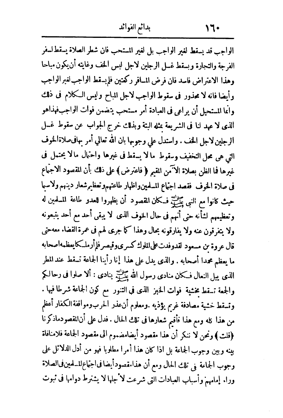 فاعترض على ذلك بأن المقصود الاجتماع في صلاة الخوف فقصد اجتماع المسلمين وإظهار طاعتهم وتعظيم شعار دينهم ولا سيما حيث كانوا مع النبي صلى الله عليه وسلم فكان المقصود أن يظهروا للعدو طاعة المسلمين له وتعظيمهم لشأنه حتى أنهم في حال الخوف الذي لا يبقى أحد مع أحد يتبعونه ولا يتفرقون عنه ولا يفارقونه بحال وهذا كما جرى لهم في عمرة القضاء معه حتى قال عروة بن مسعود: "لقد وفدت على الملوك كسرى وقيصر فلم أر ملكا يعظمه أصحابه ما يعظم محمدا أصحابه" والذي يدل على هذا أنا رأينا الجماعة تسقط عند المطر الذي يبل النعال فكان منادي رسول الله صلى الله عليه وسلم ينادي "ألا صلوا في رحالكم " والجمعة تسقط بخشية فوات الخبز الذي في التنور مع كون الجماعة شرطا فيها وتسقط خشية مصادفة غريم يؤذيه ومعلوم أن عذر الحرب ومواقفة الكفار أعظم من هذا كله ومع هذا فأقيم شعارها في تلك الحال فدل على أن المقصود ما ذكرنا.