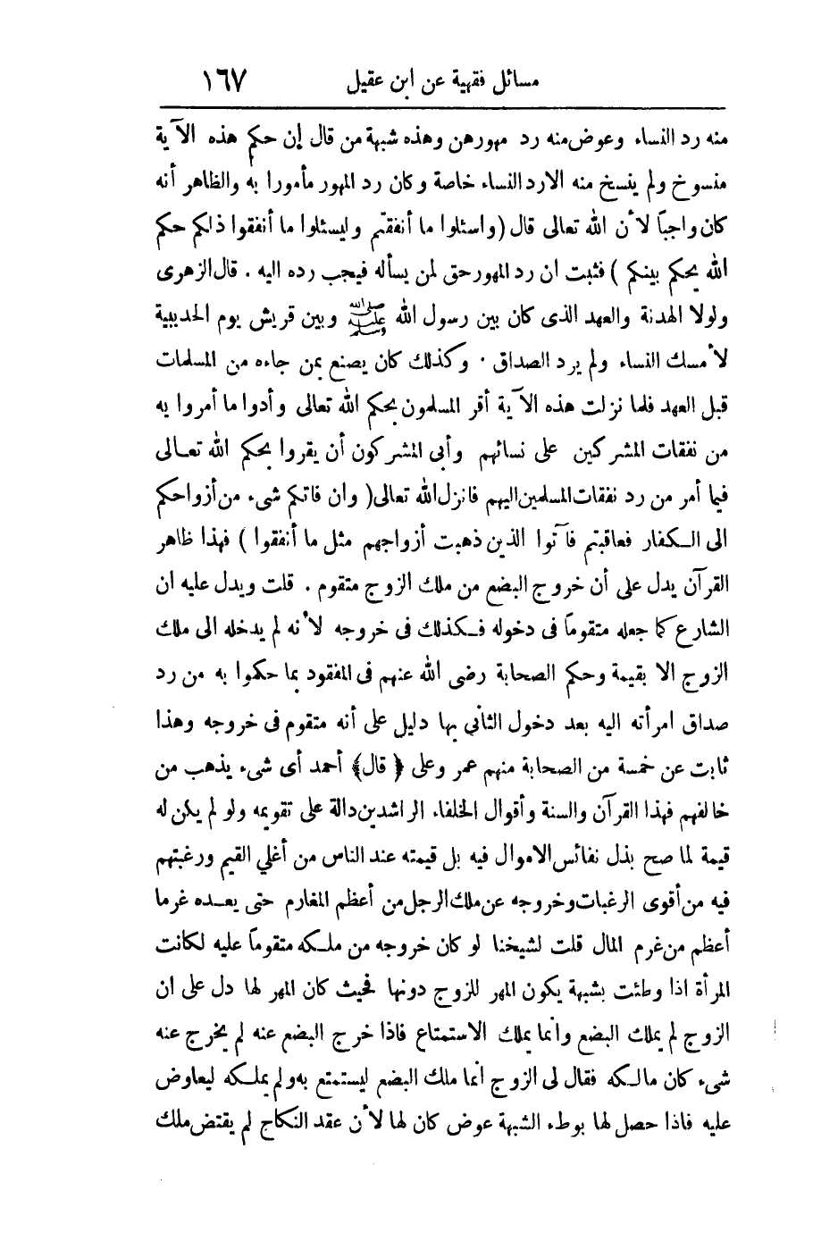 قلت ويدل عليه أن الشارع كما جعله متقوما في دخوله فكذلك في خروجه لأنه لم يدخله إلى ملك الزوج إلا بقيمة وحكم الصحابة رضي الله عنهم في المفقود بما حكموا به من رد صداق امرأته إليه بعد دخول الثاني بها دليل على أنه متقوم في خروجه وهذا ثابت عن خمسة من الصحابة منهم عمر وعلي قال أحمد: "أي شيء يذهب من خالفهم فهذا القرآن والسنة وأقوال الخلفاء الراشدين دالة على تقويمه ولو لم يكن له قيمة لما صح بذل نفائس الأموال فيه بل قيمته عند الناس من أغلى القيم ورغبتم فيه من أقوى الرغبات وخروجه عن ملك الرجل من أعظم المغارم حتى يعده غرما أعظم من غرم المال".