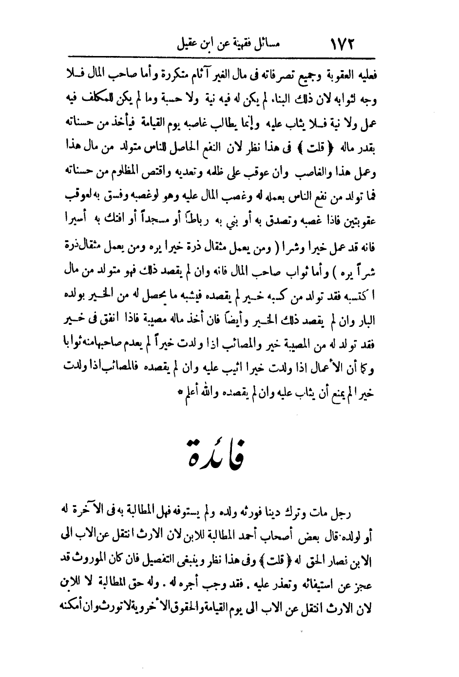 قلت: في هذا نظر لأن النفع الحاصل للناس متولد من مال هذا وعمل هذا والغاصب وإن عوقب على ظلمه وتعدية واقتص المظلوم من حسناته فما تولد من نفع الناس بعمله له وغصب المال عليه وهو لو غصبه وفسق به لعواقب عقوبتين فإذا غصبه وتصدق به أو بنى به رباطا أو مسجدا أو أفتك به أسيرا فإنه قد عمل خيرا وشرا فمن يعمل مثقال ذرة خيرا يره ومن يعمل مثقال ذرة شرا يره. وأما ثواب صاحب المال فإنه وإن لم يقصد ذلك فهو متولد من مال اكتسبه فقد تولد الخير وأيضا فإن أخذ ماله مصيبة فإذا أنفق في خير فقد تولد له من المصيبة خير والمصائب إذا ولدت خيرا لم يعدم صاحب منه ثوابا وكما أن الأعمال إذا ولدت خيرا أثيب عليه وإن لم يقصده فالمصائب إذا ولدت خيرا لم يمنع أن يثاب عليه وإن لم يقصده والله أعلم.