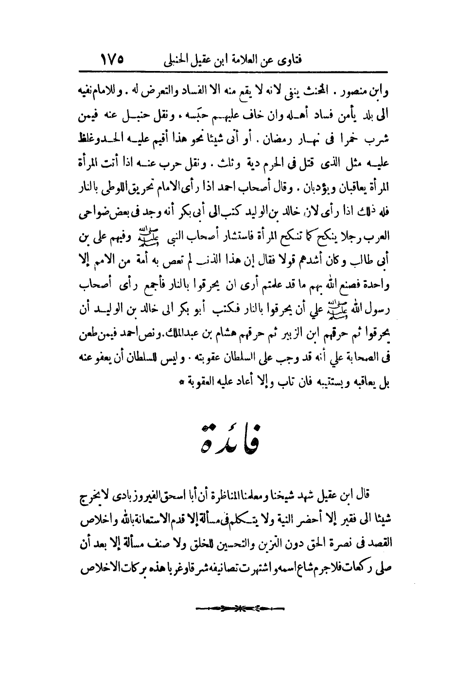 ونقل حرب عنه إذا أتت المرأة تعاقبان وتؤديان وقال أصحاب أحمد: "إذا رأى الإمام تحريق اللوطي بالنار فله ذلك إذا رأى لأن خالد ابن الوليد كتب إلى أبي بكر أنه وجد في بعض ضواحي العرب رجلا ينكح كما تنكح المرأة فاستشار أصحاب النبي صلى الله عليه وسلم علي بن أبي طالب وكان أشدهم قولا فقال: "إن هذا الذنب لم تعص به أمة من الأمم إلا واحدة فصنع الله بهم ما قد علمتهم أرى أن يحرقوا بالنار" فأجمع رأي أصحاب رسول الله صلى الله عليه وسلم على أن يحرقوا بالنار فكتب أبو بكر إلى خالد بن الوليد أن يحرقوا ثم حرقهم ابن الزبير ثم حرقهم هشام بن عبد الملك ونص أحمد فيمن طعن في الصحابة على أنه قد وجب على السلطان عقوبته وليس للسلطان أن يعفوا عنه بل يعاقبه ويستتيبه فإن تاب وإلا أعاد عليه العقوبة.