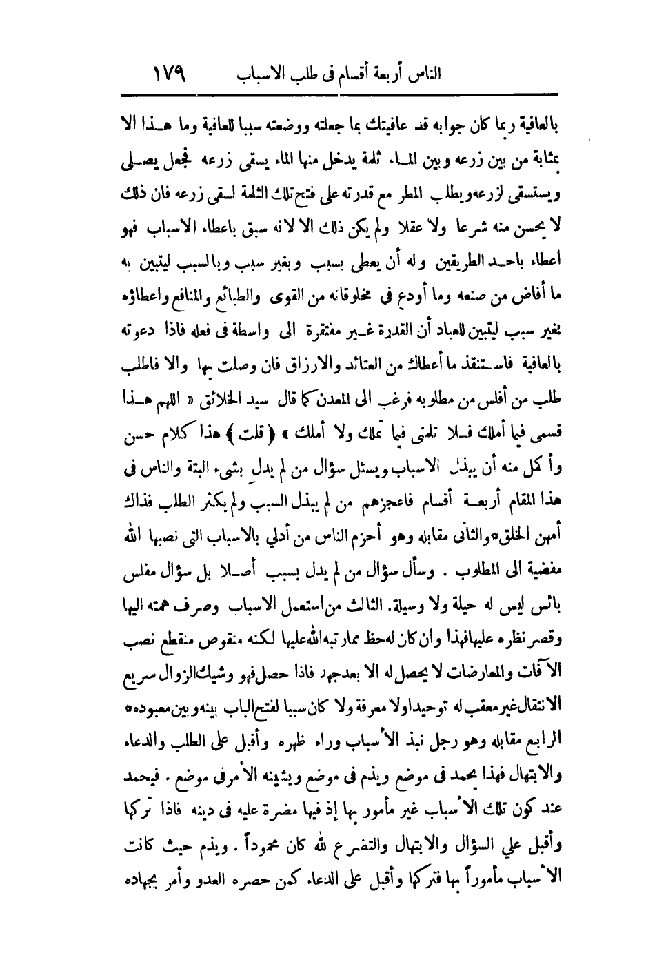 - الرابع: مقابلة وهو رجل نبذ الأسباب وراء ظهره وأقبل على الطلب والدعاء والابتهال فهذا يحمد في موضع ويذم في موضع ويشينه الأمر في موضع فيحمد عند كون تلك الأسباب غير مأمور بها إذ فيها مضرة عليه في دينه فإذا تركها وأقبل على السؤال والابتهال والتضرع لله كان محمودا ويذم حيث كانت الأسباب مأمورا بها فتركها وأقبل على الدعاء كمن حصره العدو وأمر بجهاده
