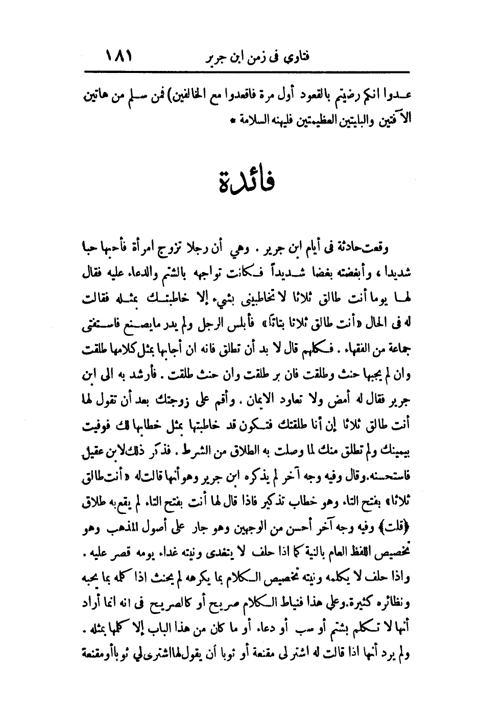 وقعت حادثة في أيام ابن جرير وهي أن رجلا تزوج امرأة فأحبها حبا شديدا وأبغضته بغضا شديدا فكانت تواجهه بالشتم والدعاء عليه فقال لها يوما: أنت طالق ثلاثا لا تخاطبيني بشيء إلا خاطبتك بمثله فقالت له في الحال: أنت طالق ثلاثا بتاتا، فأبلس الرجل ولم يدر ما يصنع فاستفتى جماعة من الفقهاء فكلهم قال: لا بد أن تطلق فإنه إن أجابها بمثل كلامها طلقت وان لم يجبها حنث وطلقت فإن بر طلقت وإن حنث طلقت. فأرشد به إلى ابن جرير فقال لها: "امض ولا تعاود الأيمان وأقم على زوجتك بعد أن تقول لها: أنت طالق ثلاثا إن أنا طلقتك فتكون قد خاطبتها بمثل خطابها لك فوفيت بيمينك ولم تطلق منك لما وصلت به الطلاق من الشرط" فذكر ذلك لابن عقيل فاستحسنه وقال: "وفيه وجه آخر لم يذكره ابن جرير وهو أنها قالت له: أنت طالق ثلاثا بفتح التاء وهو خطاب تذكير فإذا قال لها أنت بفتح التاء لم يقع به طلاق".