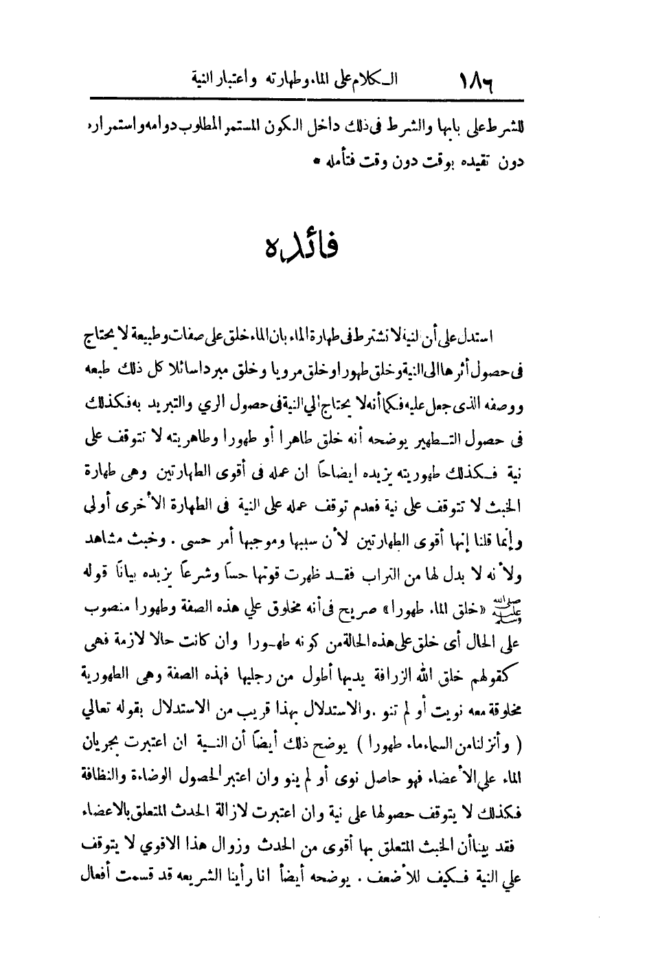 يزيده بيانا قوله صلى الله عليه وسلم: "خلق الماء طهورا" صريح في أنه مخلوق على هذه الصفة وطهورا منصوب على الحال أي خلق على هذه الحالة من كونه طهورا وإن كانت حالا لازمة فهي كقولهم: خلق الله الزرافة يديها أطول من رجليها فهذه الصفة وهي الطهورية مخلوقة معه نويت أو لم تنو.