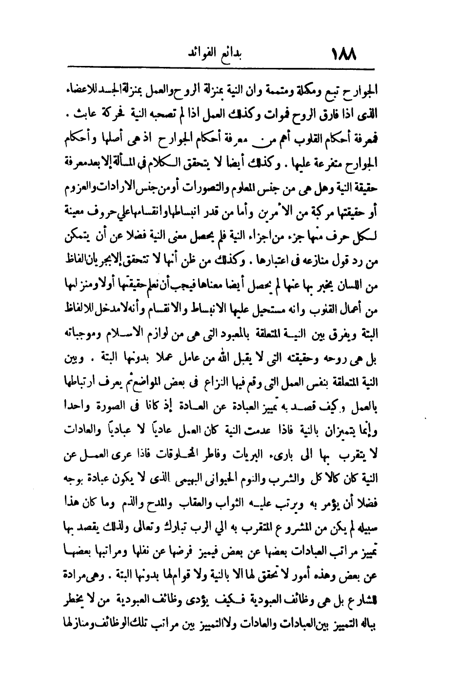 الجوارح تبع ومكملة ومتممة وأن النية بمنزلة الروح والعمل بمنزلة الجسد للأعضاء الذي إذا فارق الروح فموات وكذلك العمل إذا لم تصحبه النية فحركة عابث. فمعرفة أحكام القلوب أهم من معرفة أحكام الجوارح إذ هي أصلها وأحكام الجوارح متفرعة عليها. وكذلك أيضا لا يتحقق الكلام في المسألة إلا بعد معرفة حقيقة النية وهل هي من جنس المعلوم والتصورات أو من جنس الإرادات والعزوم أو حقيقتها مركبة من الأمرين وأما من قبيل انبساطها وانقسامها على حروف معينة لكل حرف منها جزء من أجزاء النية فلم يحصل معنى النية فضلا عن أن يتمكن من رد قول منازعه في اعتبارها.