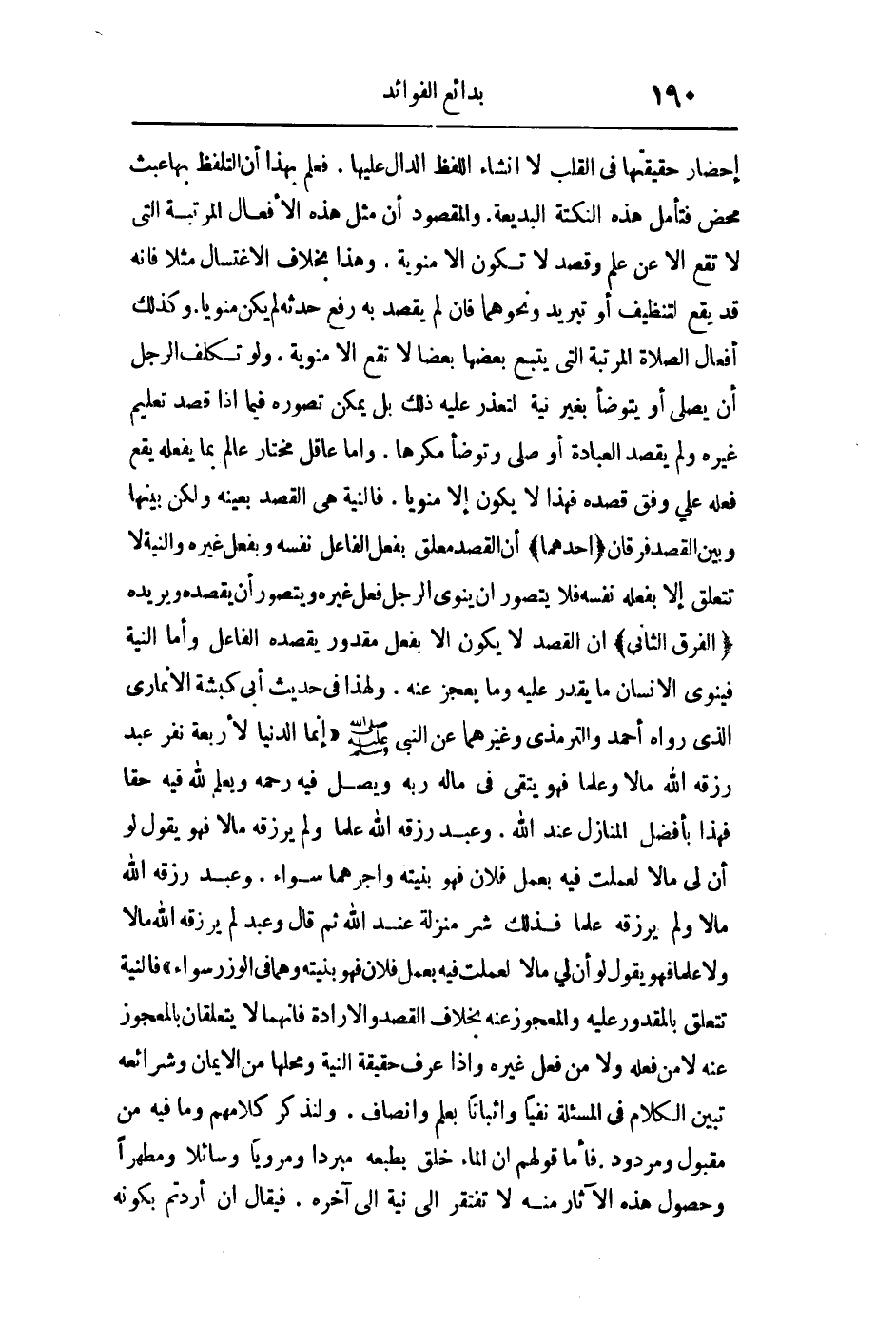 فعلم بهذا أن التلفط بها عبث محض فتأمل هذه النكتة البديعة والمقصود أن مثل هذه الأفعال المرتبة التي لا تقع إلا عن علم وقصد لا تكون إلا منوية وهذا بخلاف الاغتسال مثلا فإنه قد يقع لتنظيف أو تبريد ونحوهما فإن لم يقصد به رفع حدثه لم يكن منويا وكذلك أفعال الصلاة المرتبة التي يتبع بعضها بعضا لا تقع إلا منوية ولو تكلف الرجل أن يصلى أو يتوضأ بغير نية لتعذر عليه ذلك بل يمكن تصوره فيما إذا قصد تعليم غيره ولم يقصد العبادة أو صلى وتوضأ مكرها وأما عاقل مختار عالم بما يفعله يقع فعله وفق قصده فهذا لا يكون إلا منويا، فالنية هي القصد بعينه ولكن بينها وبين القصد فرقان: أحدهما أن القصد معلق بفعل الفاعل نفسه وبفعل غيره والنية لا تتعلق إلا بنفسه فلا يتصور أن ينوى الرجل فعل غيره ويتصور أن يقصده ويريده، الفرق الثاني: أن القصد لا يكون إلا بفعل مقدور يقصده الفاعل وأما النية فينوي الإنسان ما يقدر عليه وما يعجز عنه ولهذا في حديث أبي كبشة الأنماري الذي رواه أحمد والترمذي وغيرهما عن النبي صلى الله عليه وسلم: "إنما الدنيا لأربعة نفر عبد رزقه الله مالا وعلما فهو يتقي في ماله ربه ويصل فيه رحمة ويعلم لله فيه حقا فهذا بأفضل المنازل عند الله وعبد رزقه الله علما ولم يرزقه مالا فهو يقول لو أن لي مالا لعملت فيه بعمل فلان فهو بنيته وأجرهما سواء وعبد رزقه الله مالا ولم يرزقه علما ذلك شر منزلة عند الله " ثم قال: "وعبد لم يرزقه الله مالا ولا علما فهو يقول: لو أن لي مالا لعملت فيه بعمل فلان فهو بنيته وهما في الوزر سواء". فالنية تتعلق بالمقدور عليه والمعجوز عنه بخلاف القصد والإرادة فإنما لا يتعلقان بالمعجوز عنه لا من فعله ولا من فعل غيره وإذا عرف حقيقة النية ومحلها من الإيمان وشرائعه تبين الكلام في المسألة نفيا وإثباتا بعلم وإنصاف.
