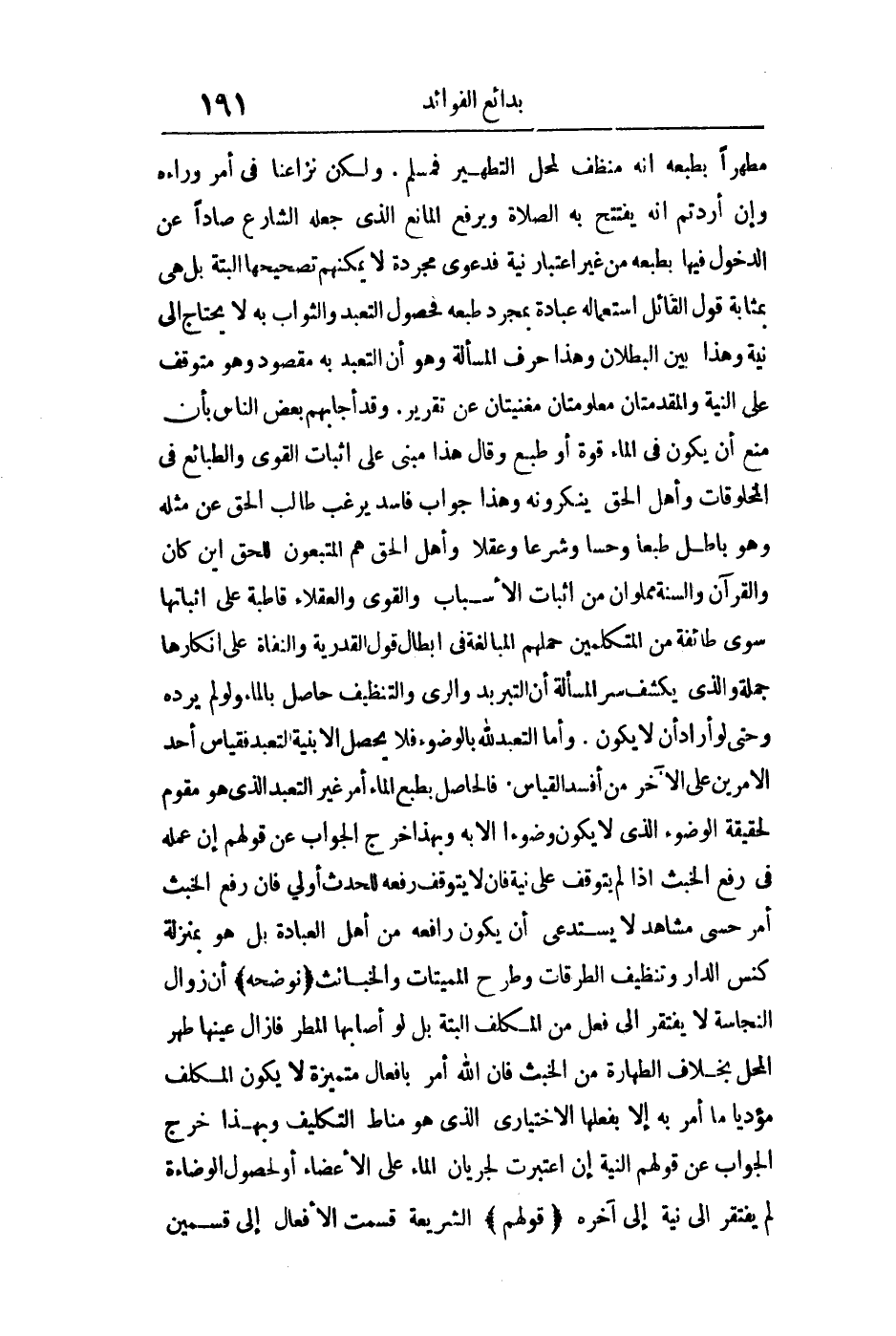 مطهرا بطبعه أنه منظف لمحل التطهير فمسلم ولكن نزاعنا في أمر وراءه، وإن أردتم أنه يفتتح به الصلاة ويرفع المانع الذي جعله الشارع صادا عن الدخول فيها بطبعه من غير اعتبار نيه فدعوى مجردة لا يمكنهم تصحيحها ألبته بل هي بمثابة قول القائل: استعماله عبادة بمجرد طبعه فحصول التعبد والثواب به لا يحتاج إلى نية وهذا بين البطلان وهذا حرف المسألة وهو أن التعبد به مقصود وهو متوقف على النية والمقدمتان معلومتان مغنيتان عن تقدير.